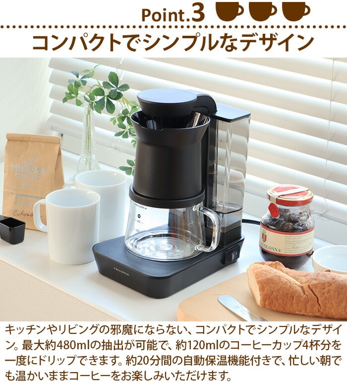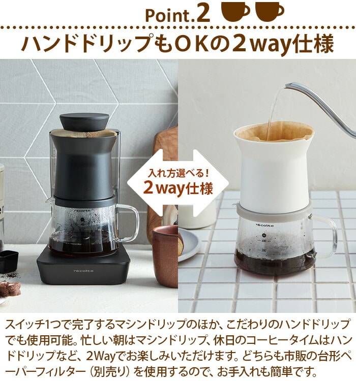 ■備考…約20分の自動保温機能付き / ペーパーフィルター(市販品/別売)使用 / 着脱可能なウォータータンク / マシン、ハンドドリップの2WAY
