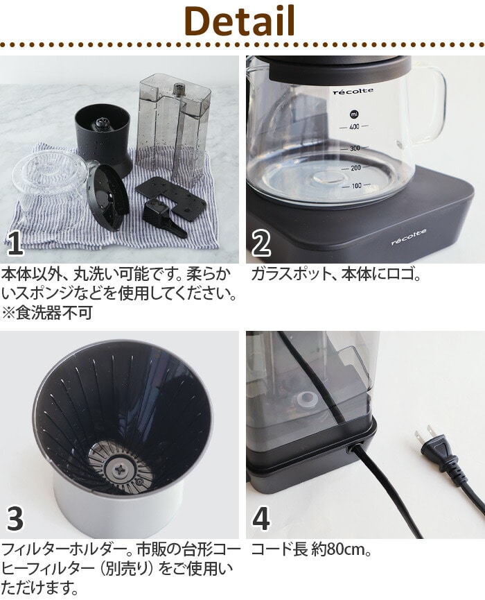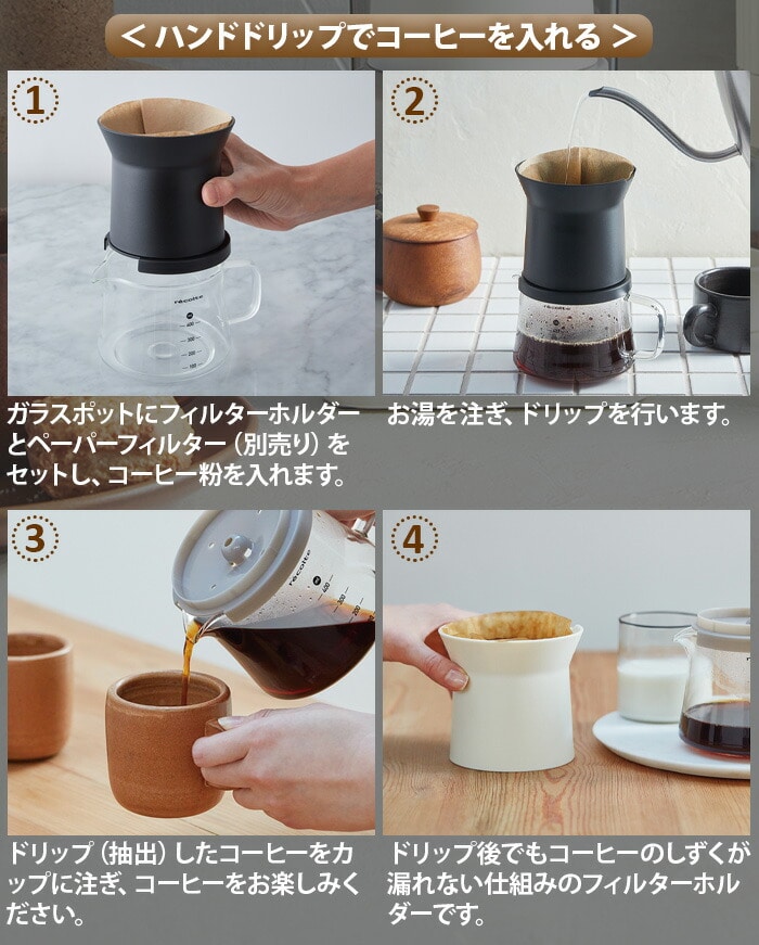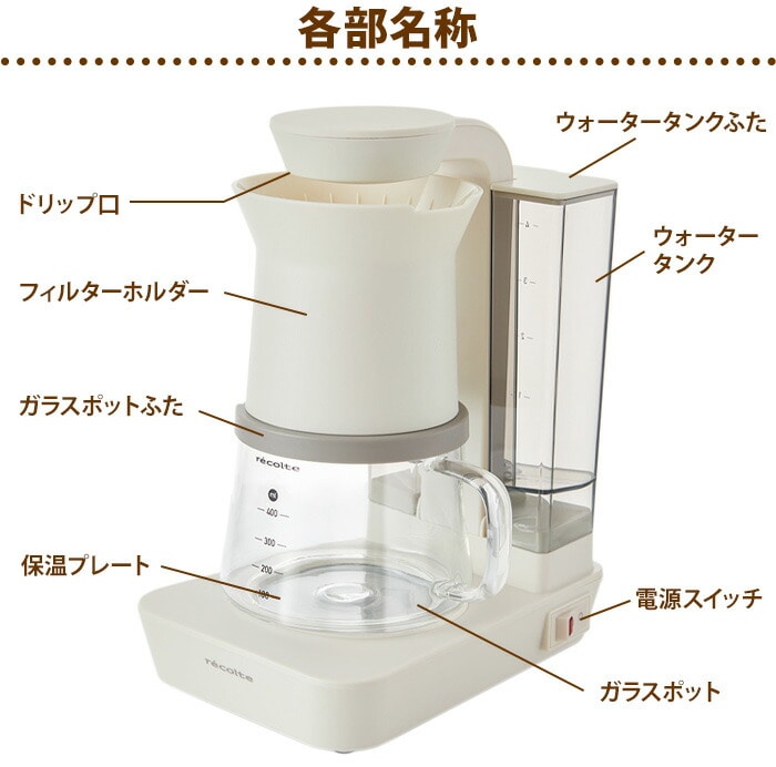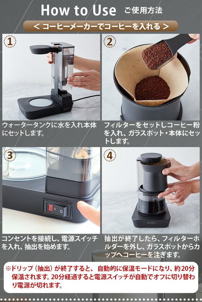 ■ご注意…本体以外のパーツは水洗い可能ですが、食器洗い乾燥機・食器乾燥機は使用しないでください。 / ガラスポットを直火にかけたり、電子レンジで使用したりしないでください。また、冷蔵庫や冷凍庫にも入れないでください。 / 電源プラグは、交流100Vで「15A125V」の壁面コンセントに直接差し込んでください。(日本国内専用) タコ足配線はしないでください。故障・発熱・火災・感電の原因になります。 / 続けて使用する場合は、5分以上やすませてください。本体が熱いうちにウォータータンクに水を入れたり、本体を動かしたりすると、蒸気や熱湯が噴出してやけどの原因になります。フィルターホルダーは使用のたびに洗浄し、乾いた布で水分を拭き取り十分に乾燥させてください。 / ストーブやガスコンロなど熱源のそばや、引火性ガスのある場所で使わないでください。発火・火災・爆発の原因、プラスチック部分が熱で破損するおそれがあります。 / ミネラルウォーターを使用した場合は、お手入れをこまめにしてください。本体内部にカルシウム分が付着しやすくなったり、付着したカルシウム分が剥がれて本体内のお湯や蒸気の出口をふさぐなど、故障の原因になります。 / 使いはじめのうちは、【本体】のプラスチック部分が熱で温められることにより、プラスチック特有のにおいがする場合があります。お使いになるうちに、においは少なくなりますが、気になる場合は1-2回【本体】の内部洗浄(水だけで抽出)を繰り返してからお使いください。それでも気になる場合は、クエン酸洗浄を行ってください
