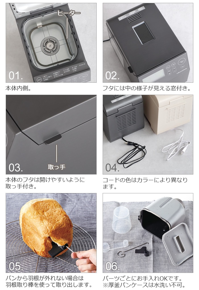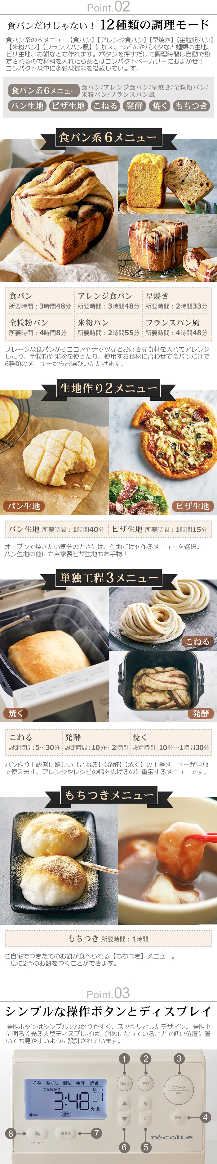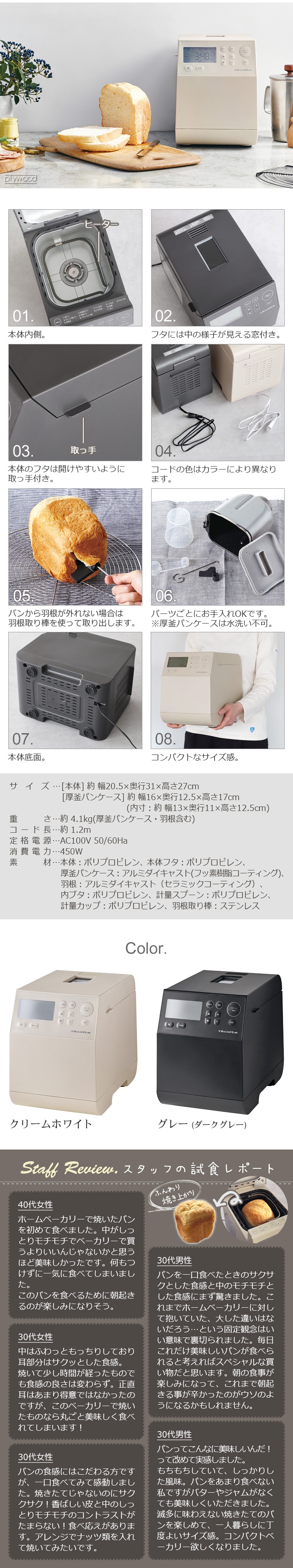 ■機能…選べる12 モードの調理メニュー:【01 食パン】【02 アレンジ食パン】【03 早焼き】【04 全粒粉パン】【05 米粉パン】【06 フランスパン風】【07 パン生地】【08 ピザ生地】【09 こねる】 【10 発酵】 【11 焼く】 【12 もちつき】 / 「焼き色」ボタンで「標準」「濃い」「薄い」からお好みの焼き色を選択 / 予約(タイマー)機能 / 操作音やブザーオンを消せるマナーモード機能 / ※予約設定/焼き色設定食パン系6メニューにのみ設定可能です。「パン生地」「ピザ生地」「こねる」「発酵」「焼く」「もちつき」メニューは設定不可。 ■備考…1斤サイズ / 蓄熱効果の高い厚釜パンケース(厚さ2.5mm)を使用 / 豪華なレシピブック付き(全52品目) / コンパクトでスタイリッシュなデザイン / どんな角度からも見やすいLEDライト内蔵のディスプレイ