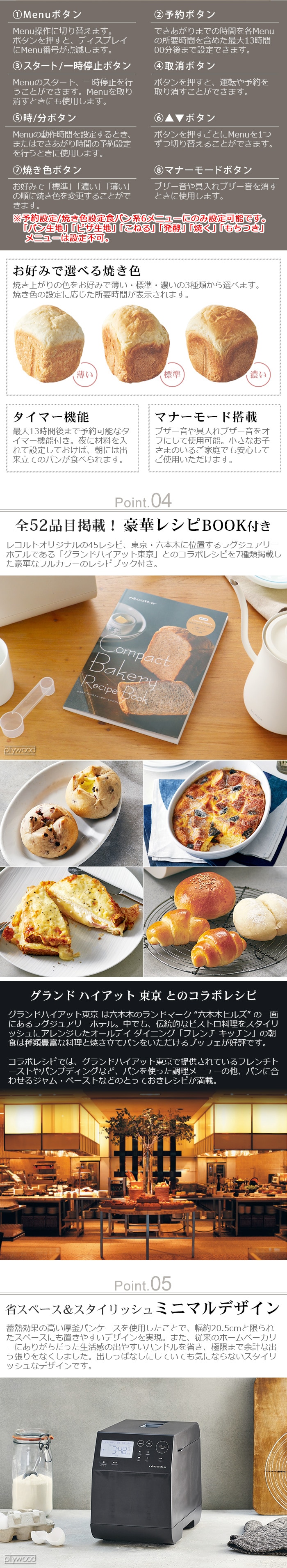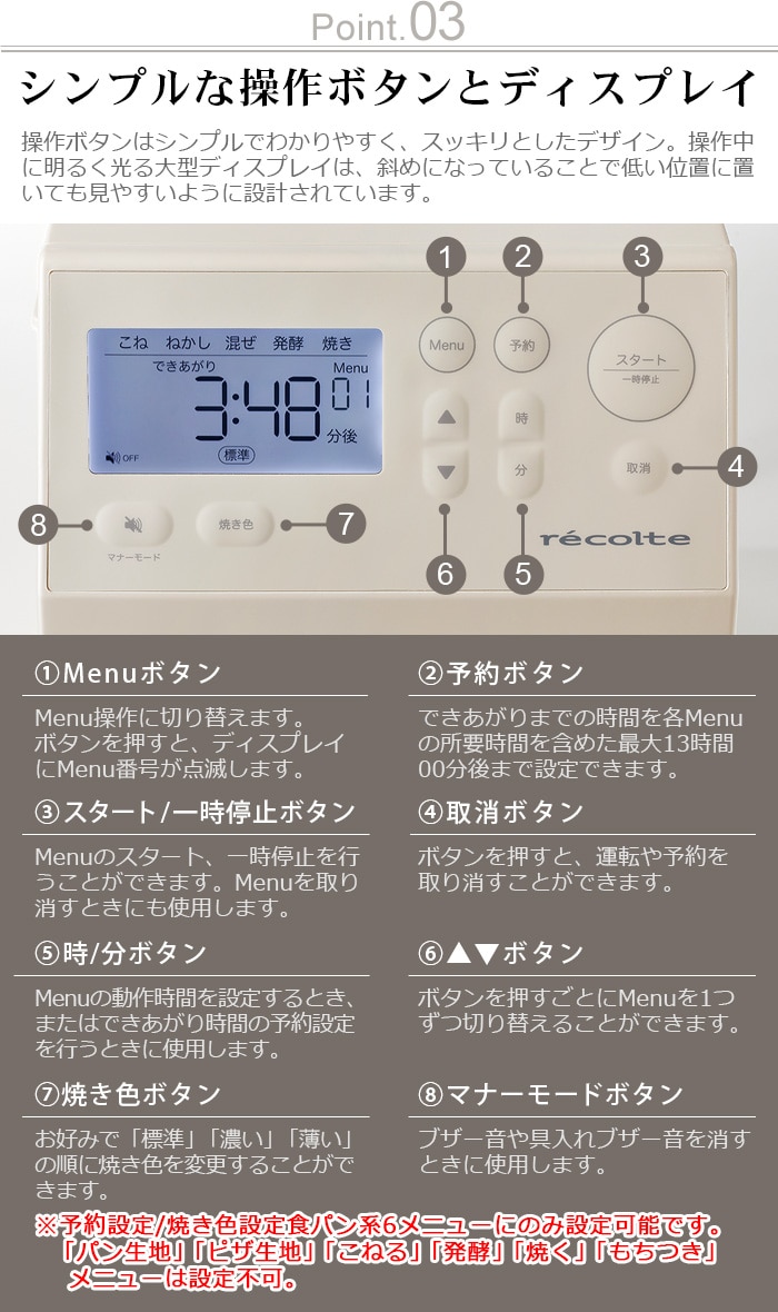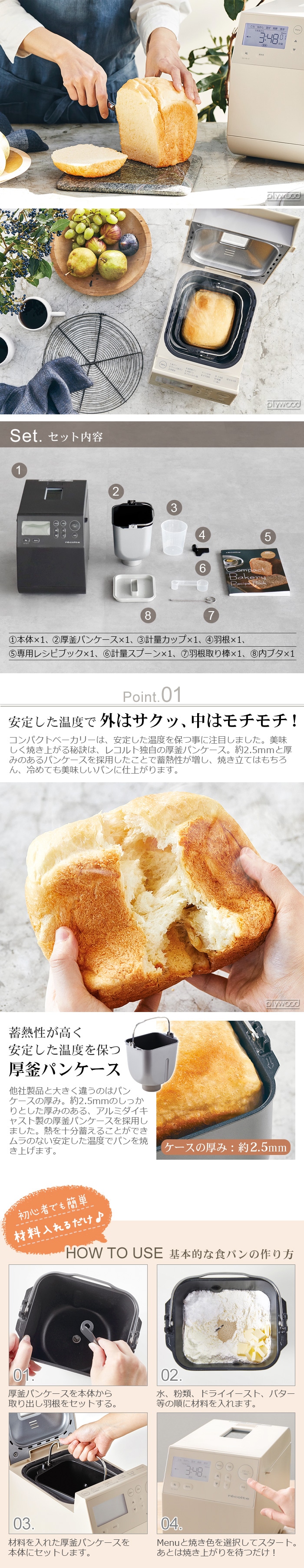 ■機能…選べる12 モードの調理メニュー:【01 食パン】【02 アレンジ食パン】【03 早焼き】【04 全粒粉パン】【05 米粉パン】【06 フランスパン風】【07 パン生地】【08 ピザ生地】【09 こねる】 【10 発酵】 【11 焼く】 【12 もちつき】 / 「焼き色」ボタンで「標準」「濃い」「薄い」からお好みの焼き色を選択 / 予約(タイマー)機能 / 操作音やブザーオンを消せるマナーモード機能 / ※予約設定/焼き色設定食パン系6メニューにのみ設定可能です。「パン生地」「ピザ生地」「こねる」「発酵」「焼く」「もちつき」メニューは設定不可。 ■備考…1斤サイズ / 蓄熱効果の高い厚釜パンケース(厚さ2.5mm)を使用 / 豪華なレシピブック付き(全52品目) / コンパクトでスタイリッシュなデザイン / どんな角度からも見やすいLEDライト内蔵のディスプレイ