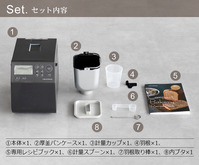 ■内容…本体×1、厚釜パンケース×1、計量カップ×1、羽根×1、内ブタ×1、計量スプーン×1、羽根取り棒×1、専用レシピブック×1