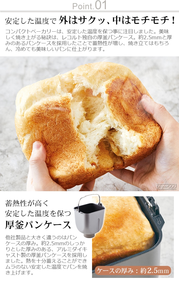 コンパクトベーカリーは美味しいパンを焼く為に、安定した温度を保つ事に注目しました。厚さ約2.5mmの厚釜パンケースを採用することで、ムラのない安定した温度で一気に焼き上げます。パンの耳は薄くカリッと、中はもっちりとした食感が楽しめます。