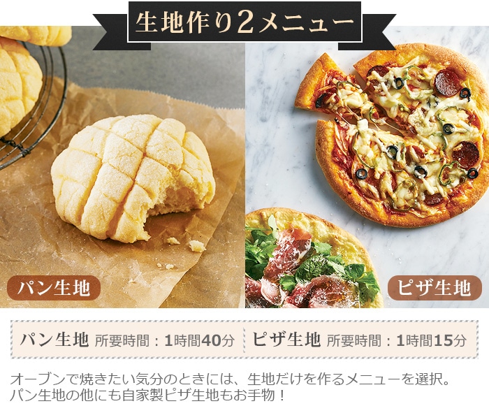 操作ボタンは見やすく、シンプルに。難しい設定は不要です。材料を入れて、ボタンを押すだけ。自分で材料を選べるからアレルギー対策にも◎毎日飽きずに食べられる食パン系の6メニュー「食パン」「アレンジ食パン」「早焼き」「全粒粉パン」「米粉パン」「フランスパン風」に加え、うどんやパスタなど麺類の生地、ピザ生地、おもちなども作れるので自宅で楽しめるお料理の幅がぐんと広がります。