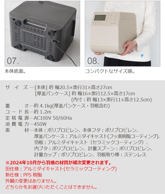 ■素材…本体・本体フタ:ポリプロピレン / 厚釜パンケース:アルミダイキャスト(フッ素樹脂コーティング) / 羽根:アルミダイキャスト(セラミックコーティング) / 内ブタ:ポリプロピレン / 計量カップ、計量スプーン:ポリプロピレン / 羽根取り棒:ステンレス※2024年10月から羽根の材質が順次変更されます。 旧仕様:アルミダイキャスト(セラミックコーティング) 新仕様:PPS 樹脂 外観の変更はありません。どちらかをお選びいただくことはできません。 ■電源…AC100V 50/60Hz