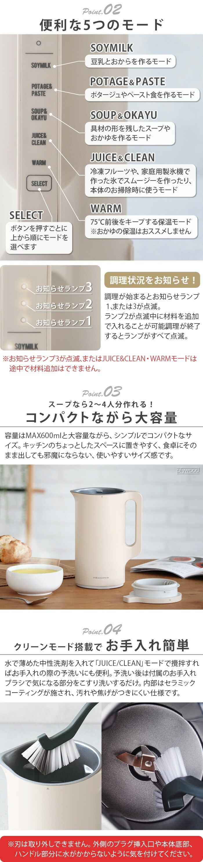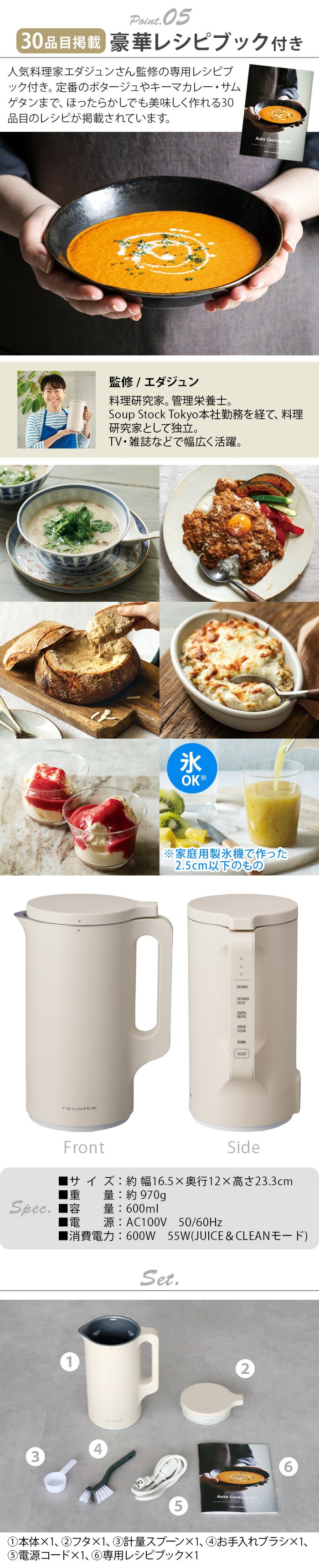 ■仕様変更について…※2023年2月にモデル変更しました。「recolte Soy&Soup Blender」の後継モデルです。旧モデルとは仕様が異なります。【変更箇所】デザインが変更されました。 / モードが追加されました。 / サイズ、重量、容量、消費電力が変更されました。/2024年12月下旬から電源コードの仕様が変更となり、新旧はお選びいただけません。