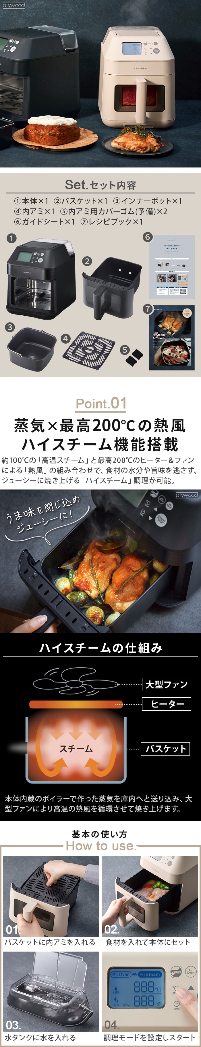 「ハイスチームエアーオーブン]は、熱風調理で油で揚げない揚げ物でおなじみの「ノンフライヤー」に「スチーム」機能をプラスしたコンベクションオーブン。約100℃の高温スチームと熱風を組み合わせることで、食材から潤いを逃さず、「蒸しながら焼く」というハイレベルな調理がご自宅で簡単に愉しめます。材料を入れてボタンを押したら後はお任せ!他のお料理と並行して「ながら調理」も可能です。