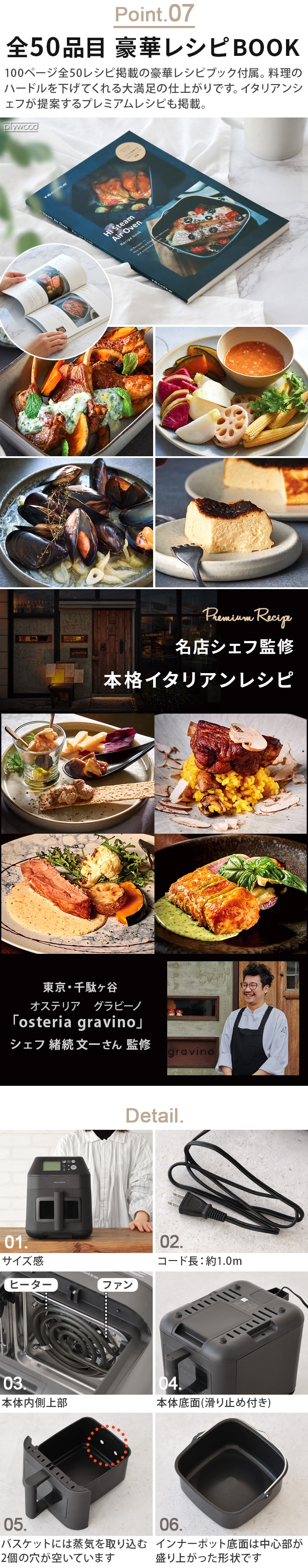 ■仕様変更について…※2025年3月にモデル変更しました。「recolte エアーオーブン RAO-1」の後継モデルです。旧モデルとは一部の仕様が異なります。【変更箇所】デザイン、サイズが変更されました。 / ハイスチームモード、コンボモードが追加になりました。 / インナーポットが付属になりました。