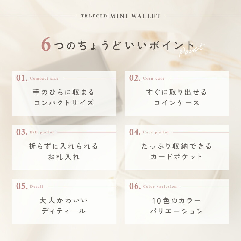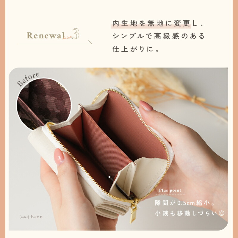 旅行中は手荷物を極力減らして身軽でいたいですよね 発売当初からずーっと人気の「ちょうどいいミニ財布」が新色を迎えてついにリニューアル。 レビューでもお声の多かった内生地を、柄から無地へ変更。 ファスナーデザインも変え、全体的に大人っぽく、上品な仕上がりになりました。 もちろん、お客さまから好評いただいている 取り出しやすい小銭入れと、 ゆとりのあるお札入れなどのいいところはそのまま。 どなたでも使いやすいサイズ感だから、 メインのお財布としてだけでなく ご家族共通のお財布や、 お子さまの初めてのお財布にもぴったりです。 カラーは、持ちやすい定番カラーと 気分の上がるちょっと華やかなカラー 計10色をご用意しました。 ぜひ、色選びもお楽しみください♪