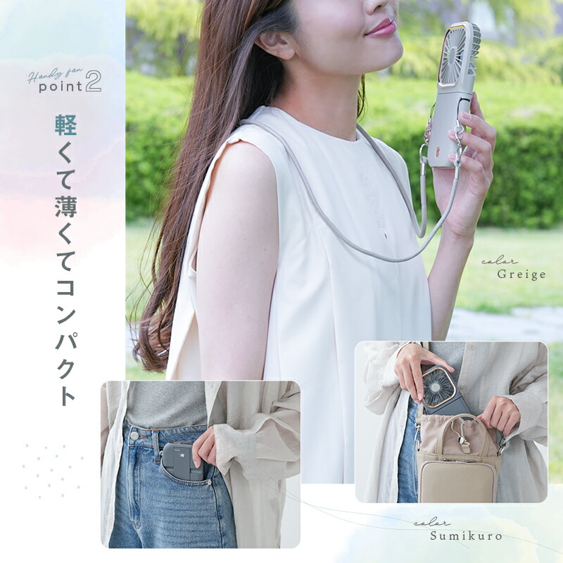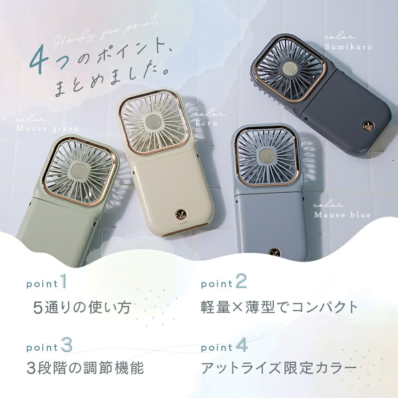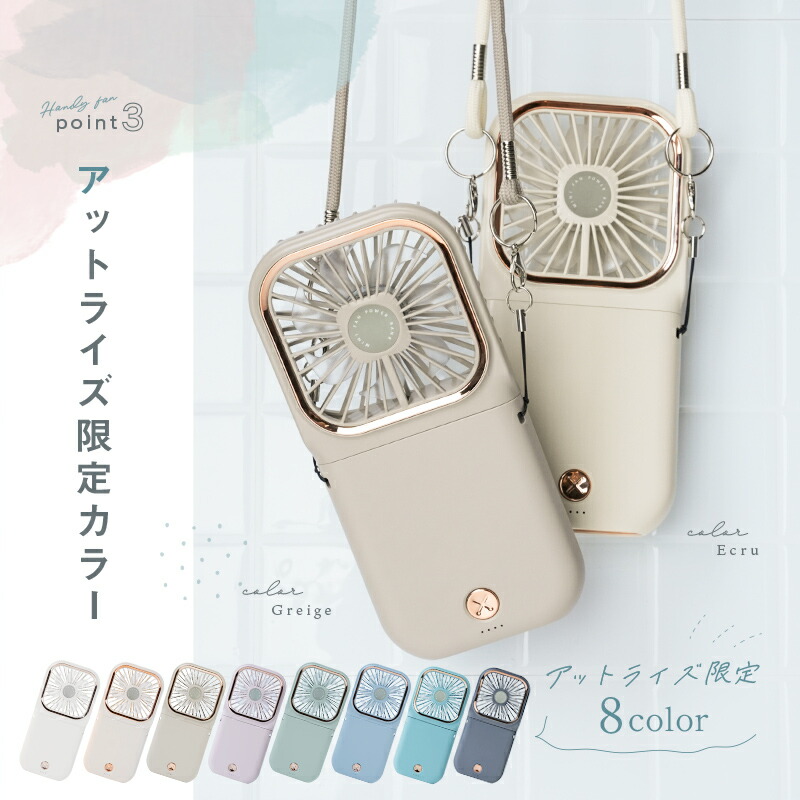 毎年大人気!atRiseのハンディファンが 更に更にリニューアルしました! 今年は大人かわいい3色を新たに追加。 羽の形を改良し、風当たりも滑らかになりました。 また、ネックストラップも扱いやすい形状へと変更。 より使いやすく、見た目もおしゃれに◎ もちろん、従来のいいところはそのまま。 旅行や、お出かけはもちろん、オフィスなどでも活躍できます。 スリム&軽量タイプで、 ミニバッグやポケットの中にもすっぽり収納。 テーマパークやアウトドア、 通勤や通学に、ぜひお供させてください♪