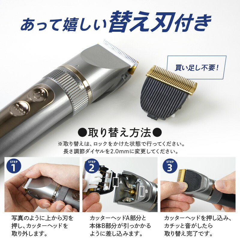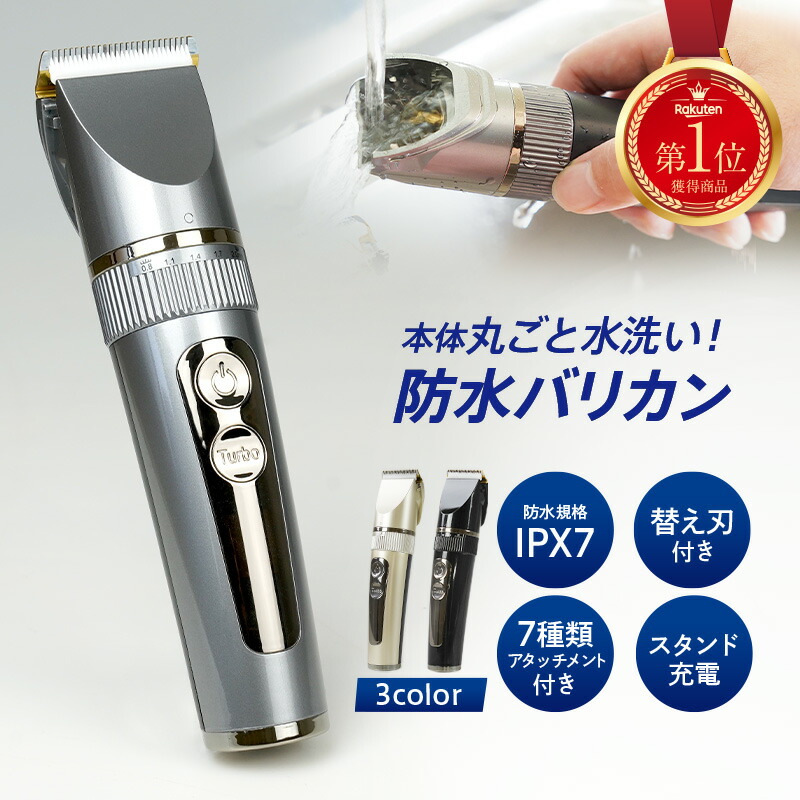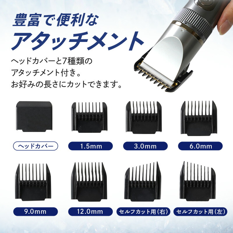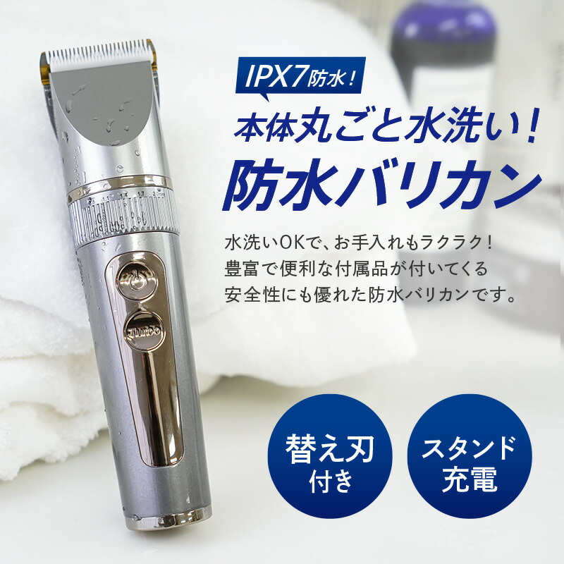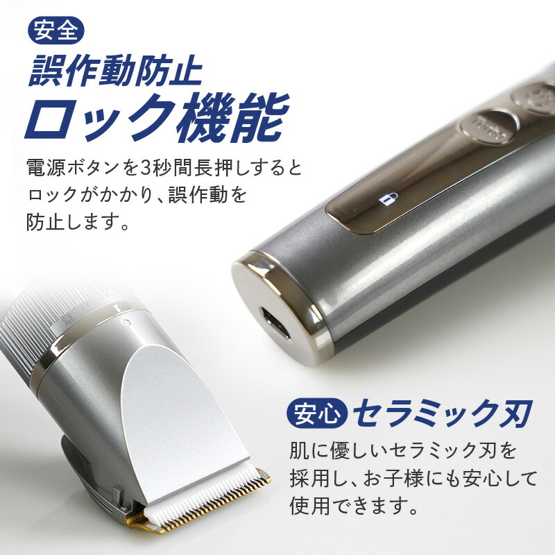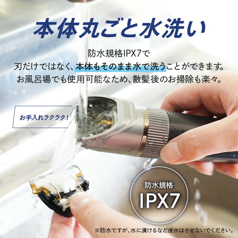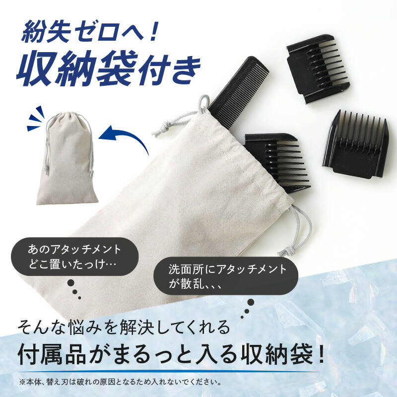 大人も子供にも使える!収納袋付きで保管や持ち運びも楽ちんな防水バリカン セルフカットや子供の髪をカットしたいけど、バリカンのお手入れが億劫で、つい先延ばしに・・ そしてそうこうしているうちに、もっと面倒なことになってしまいますよね。 そうなる前に! 本体丸ごと水洗いできる、お手入れラクラクな防水バリカンのご紹介です。 アタッチメントや替え刃といった付属品も充実。 刃の長さ調節や速さもお好みで設定でき、稼働音も控えめなので、ストレスフリーでお使いいただけます。 また、肌に優しいセラミック刃を採用しているため、お子さまの髪も安心してカットすることができます。 充電する際はスタンドに立てるだけ! コードレスで使用中に絡まる心配もないので、鏡を見ながらのセルフカットも◎ アタッチメントをまとめておける便利な収納袋と、わかりやすいWEBマニュアル付きだから 初心者の方にもおすすめのバリカンです。 【スペック】 サイズ:18.5cmx4.5cmx4.2cm 素材:セラミック(刃)、フランネル(収納袋) 本体重さ:190g 充電スタンド重さ:30g 【付属品】 本体/替え刃/充電ケーブル/充電スタンド/お手入れブラシ/ コーム/収納袋/ヘッドカバー、アタッチメント(7種)/ 日本語クイックガイド