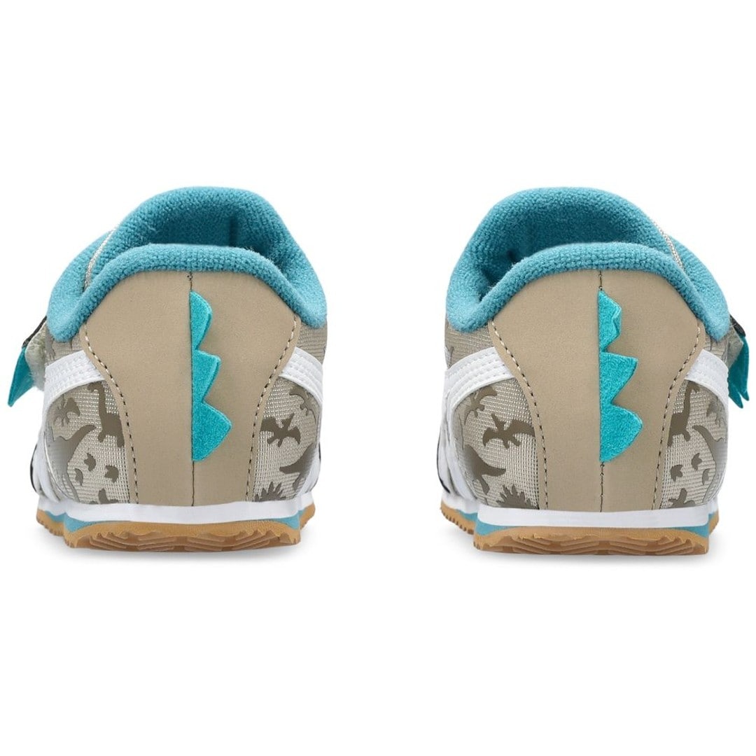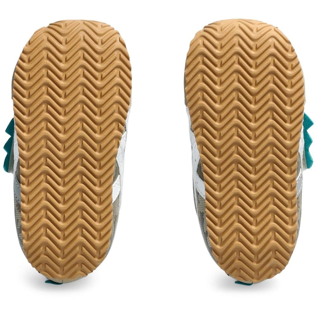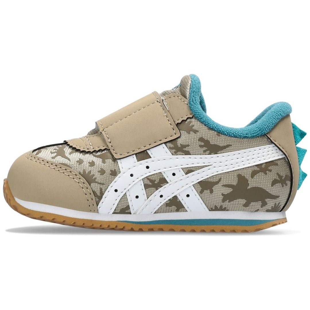 約1歳から3歳の幼児向けに展開する「BABY」シリーズのローカットシューズ。子どもたちの大好きな恐竜をモチーフにした、遊び心のあるアイテムです。かかとの安定性を重視し、かかとを包み込む立体的な中敷を採用しています。扇形のつま先部分は足ゆびをのびのびと動かすことができ、踏ん張りやすいのが特徴。インナーソールの素材には抗菌・消臭効果のあるシャインアップと、汗をすばやく吸収、拡散してドライ感を保つウォーターマジックを採用。靴の中を快適に保ちます。甲の内側を1枚の布で包み込むような構造のキモノフィットタンを採用。フィット感を高め、アーチ部の倒れ込みを軽減します。アッパーはいろいろな種類の恐竜の姿や足跡などをプリントしたデザインで、どんな恐竜がいるのか親子で見つけるのも楽しみ。かかと部とベルトには、恐竜の背中をイメージするギザギザのモチーフを配置しています。街灯や車のライトなどの光を反射する再帰反射材(リフレクター)を外側のアシックスストライプの一部に採用しています。■キーワードスニーカー、キッズ、子供、小学生、ウォーキングシューズ、通学●素材本体=ポリエステル・人工皮革 アウターソール=ゴム底