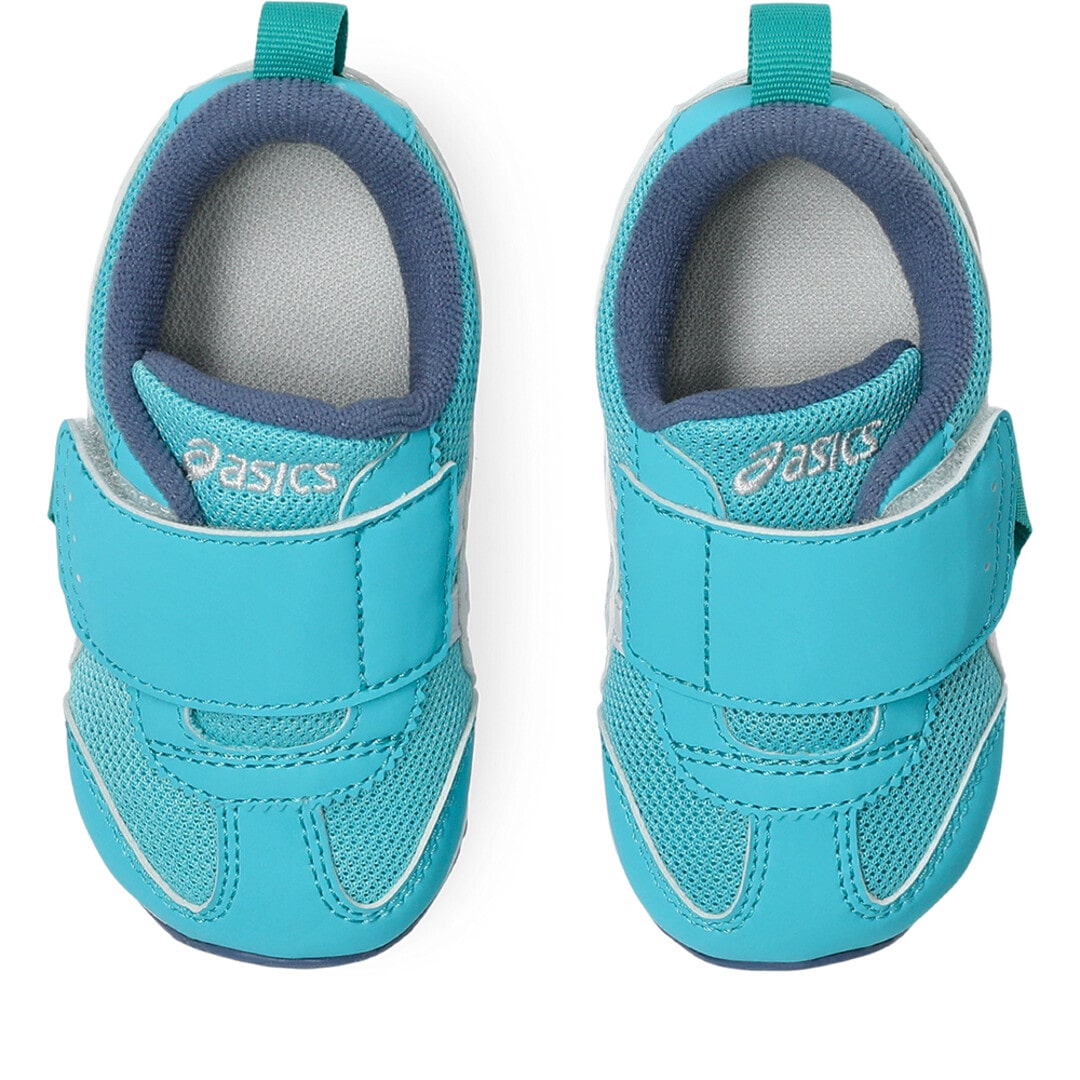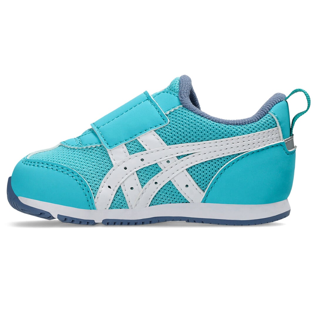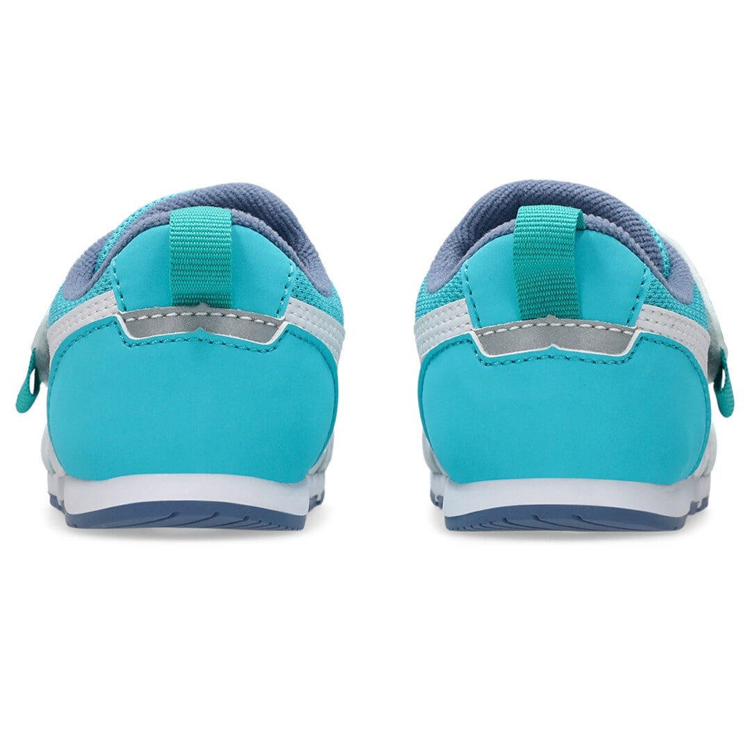 約1歳から3歳の幼児向けに展開する「BABY」シリーズのローカットシューズ。扇形のつま先部分は足ゆびをのびのびと動かすことができ、踏ん張りやすいのが特徴です。アウターソールは、足の屈曲位置に合わせて溝を配置した「フレックスグルーヴ」を採用。足の動きにしなやかに追従します。かかとの安定性を重視し、かかとを包み込む立体的なインナーソールを使用しています。インナーソールの表面材には抗菌・消臭効果のあるシャインアップと、汗をすばやく吸収・拡散してドライ感を保つウォーターマジックを採用。靴の中を快適に保ちます。甲の内側を1枚の布で包み込むような構造のキモノフィットタンにより、フィット感を高め、アーチ部の倒れ込みを抑えます。アッパーは通気性に優れたラッセルメッシュを使用。街灯や車のライトなどの光を反射する再帰反射材(リフレクター)をかかと部に配置しています。