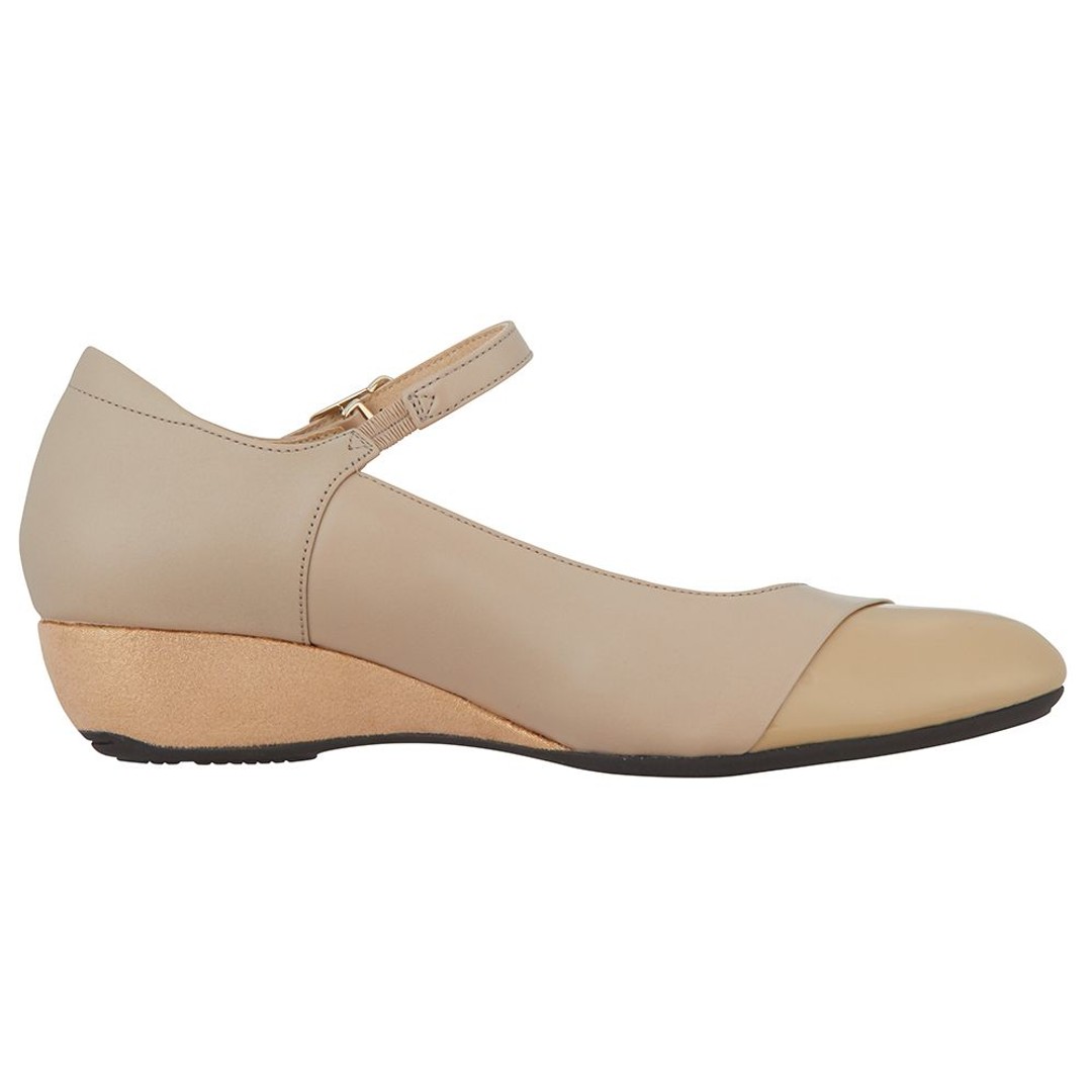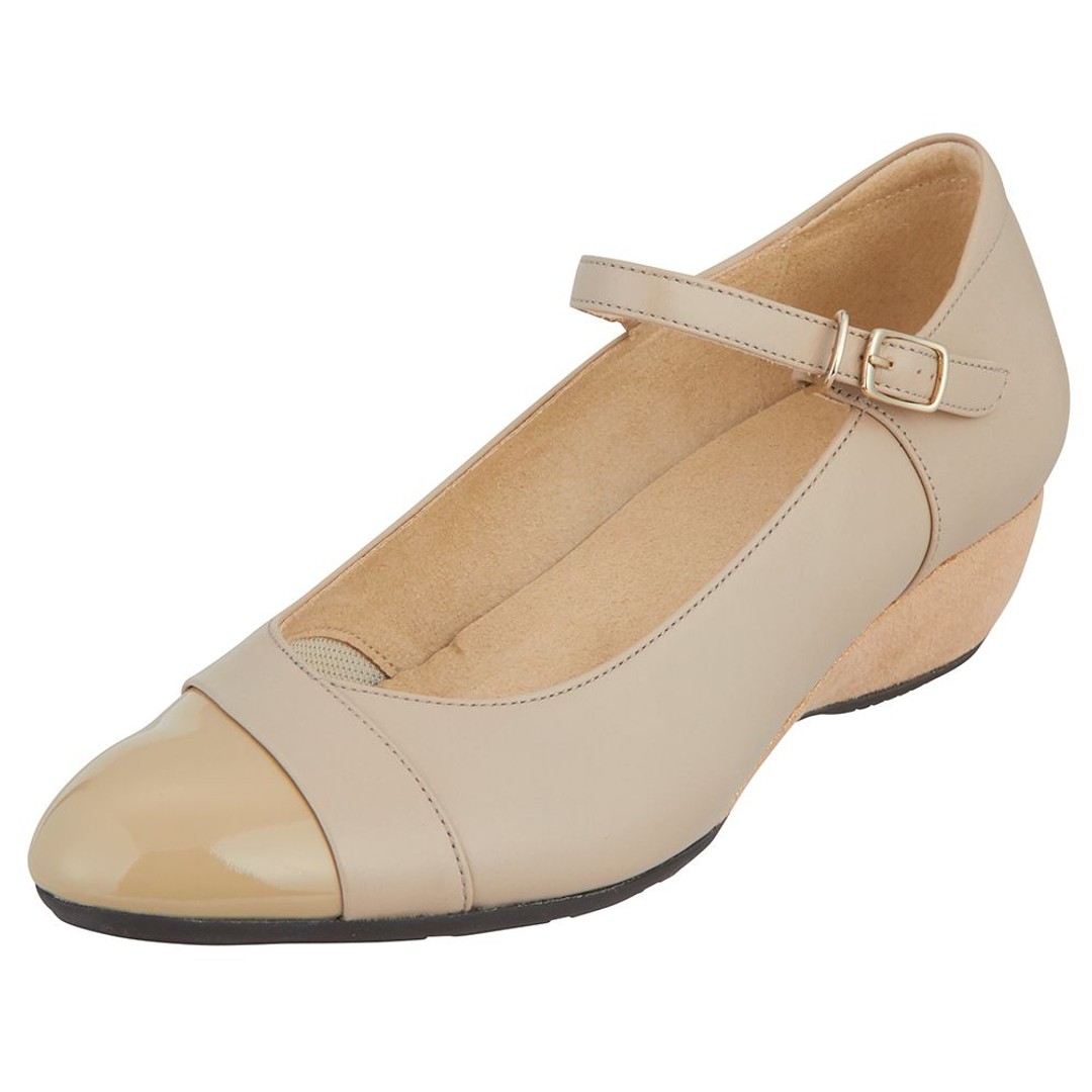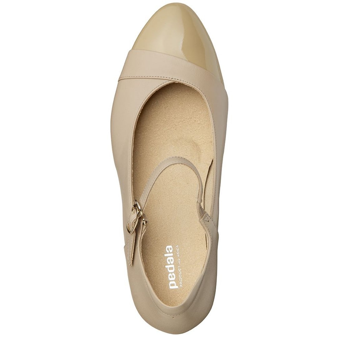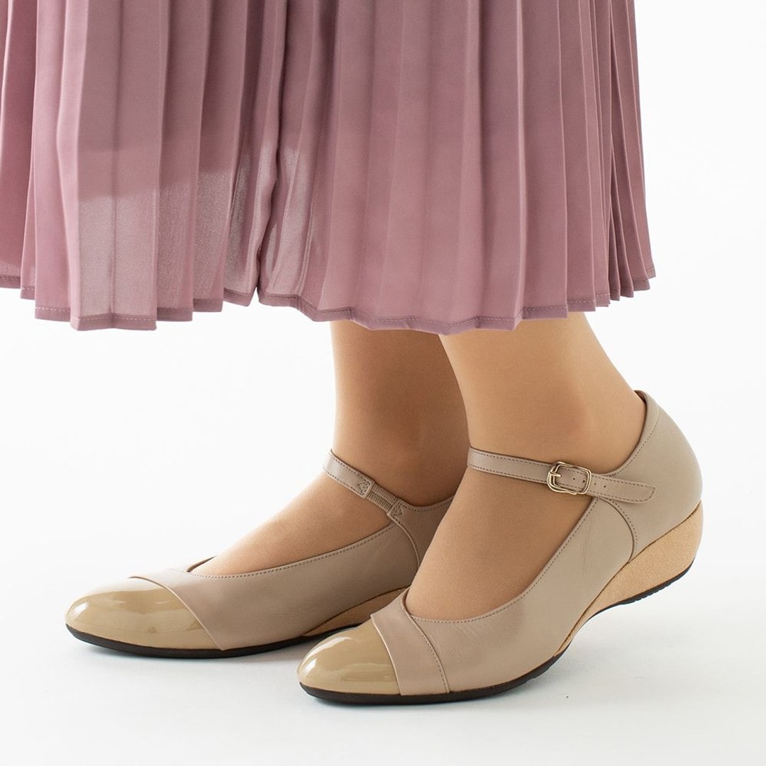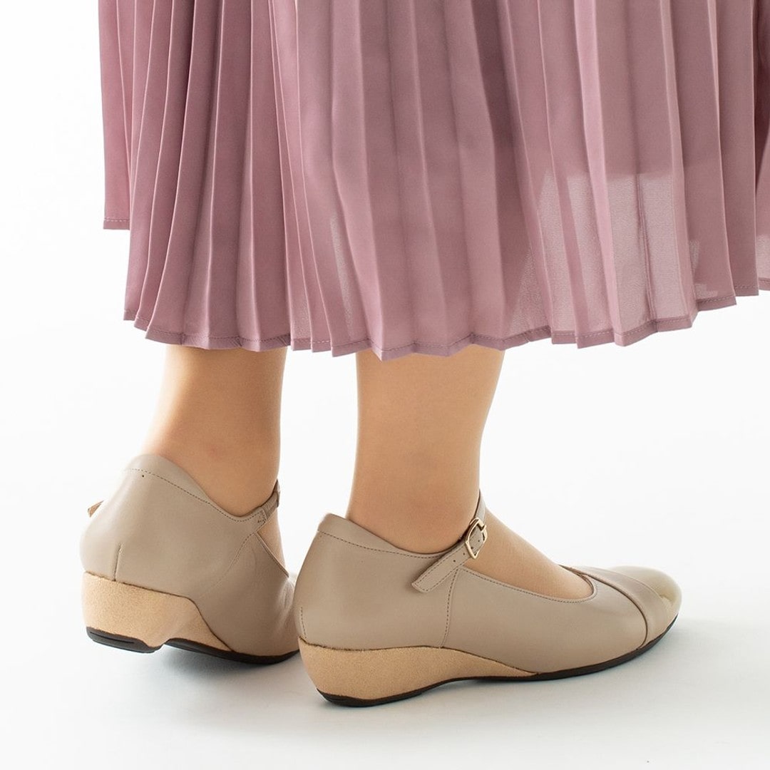素足のような軽さと、長時間の歩行でも足への負担が少ないクッション性のよさが特長の、PEDALAシリーズ。ストラップ付きのウエッジヒールパンプスです。おしゃれ仕立てのウエッジヒールを採用し、ドレス感を演出しています。ヒール内部にSPEVAを使用することで、軽さとクッション性を追求。アッパー前足部のライニングにはスポンジ材を配置して履き心地のよさを向上しています。アッパーは上品な質感の天然皮革(牛革)で、つま先部分のエナメルがアクセントに。エレガントなデザインと機能性を兼ね備えた、カジュアルにもシックにも履きこなせる一足です。●素材本体=天然皮革(牛革) アウターソール=ゴム底