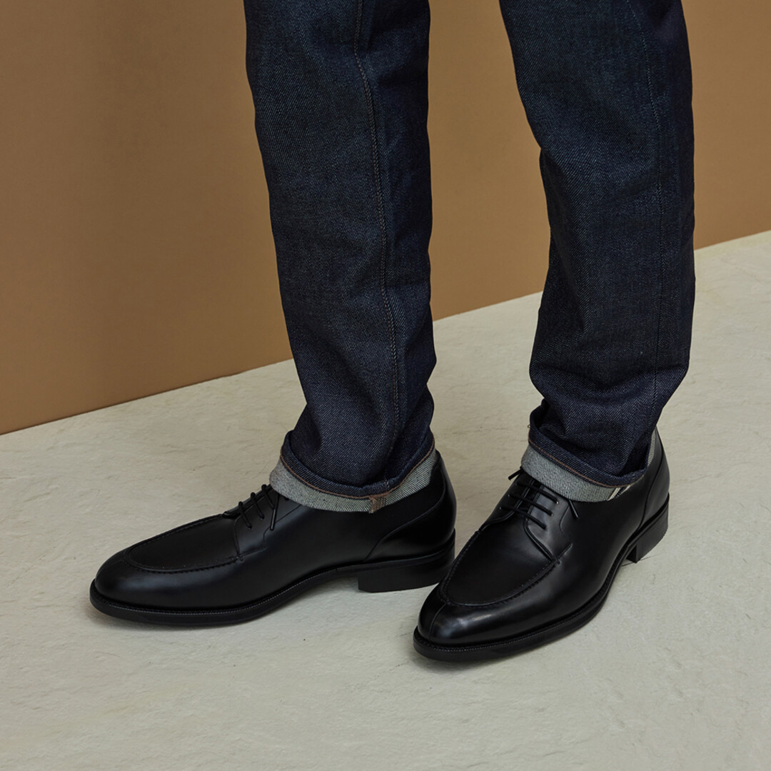 U字型にステッチを施した外羽根Uチップデザイン、ラウンドシルエットのドレスシューズ。アッパーにはフランス産の上質な原皮を使用したキップレザーを採用。シャドースプレーのツヤを強調し、木型の陰影がきれいに出る仕上げを施しています。ライニングにも牛革を使用。インナーソールは足なじみのよいオーソライト中敷。ミッドソールにはクッション性と反発性を併せもつSPEVA、かかと部にfuzeGELを搭載し、快適な歩行をサポートします。中足部はTPUシャンクにより、歩行の安定性に配慮。アウターソールの擦り減りやすい部分には、耐摩耗性に優れたAHARラバーを採用しています。※RUNWALK 7 LSはRUNWALK 7 LUXURY DRESS SHOESの略称です。●素材本体=天然皮革/人工皮革 アウターソール=ゴム底