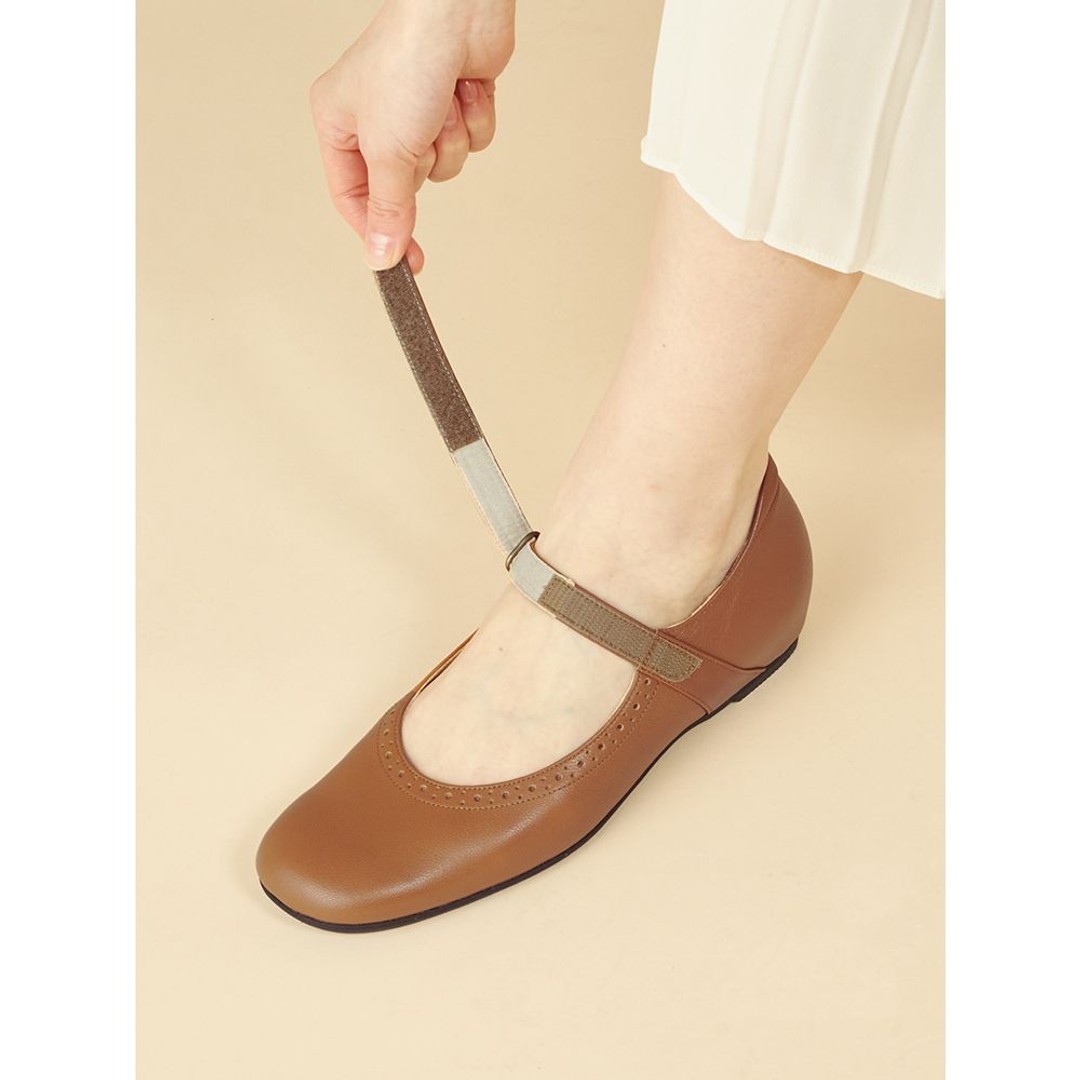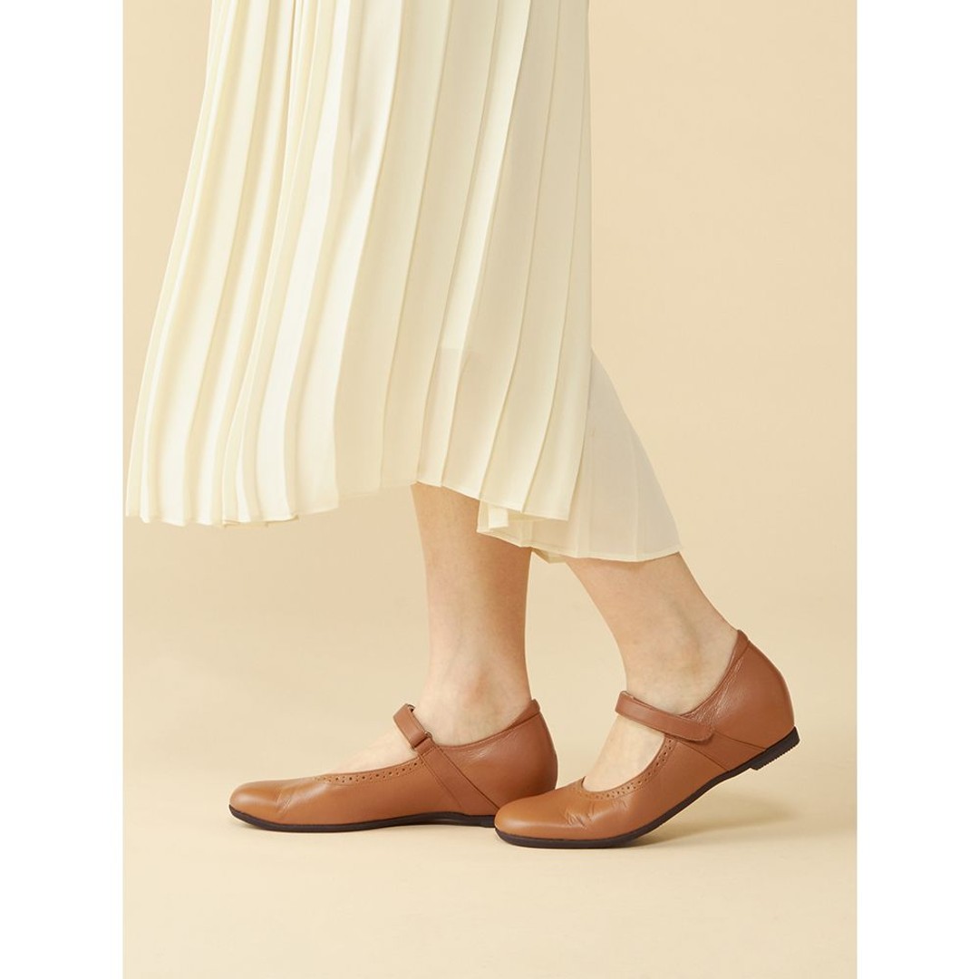 素足のような軽さと、足をやさしく包み込むやわらかさが特長のPEDALAシリーズ。インヒール構造のパンプスです。ストラップ付きで甲部分のフィット感に優れています。細めのEウイズで、足ゆびに優しいオブリークラスト。縁にあしらった飾り穴がデザインのアクセント。ビジネスからカジュアルまでさまざまに活用できるロングセラーモデルです。●素材本体=天然皮革(山羊革)・天然皮革(牛革) アウターソール=ゴム底