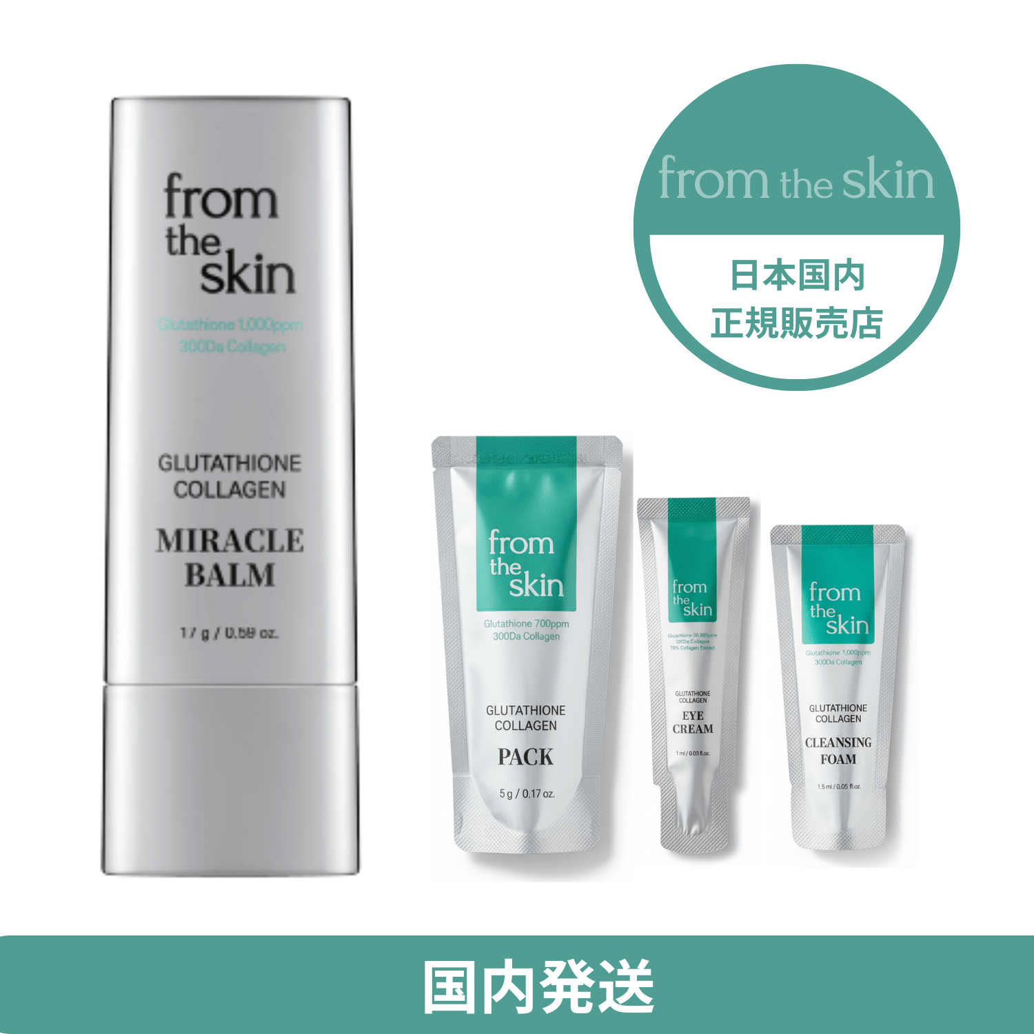 フロムザスキン グルタチオンコラーゲン ミラクルバーム 高濃度グルタチオンとコラーゲンをたっぷり配合したスティックタイプの多機能バーム。 メイク前や外出先でさっと塗るだけで、うるおい・ハリ・透明感を与えながらUVケアも同時に叶えます。 ポーチに入るコンパクトサイズで、いつでもどこでも美肌をキープ。 こんな方におすすめ 日中の乾燥やくすみが気になる方 手軽に使える保湿・UVケアアイテムをお探しの方 メイクのツヤ出しやメイク直しをしたい方 ポーチに常備できるマルチなアイテムが欲しい方 主な成分と効果 ◆ グルタチオン・コラーゲン 肌のハリと透明感をサポートし、若々しい印象へ導きます。 ◆ 乳酸菌発酵エキス 肌のコンディションを整え、健やかな状態を保ちます。 ◆ UV保護成分(オクトクリレン) 日常の紫外線から肌を守り、健康的な肌を維持します。 ご使用方法 バームを繰り出し、乾燥や紫外線が気になる部分に直接塗布します。 指やブラシで軽くなじませると、より自然なツヤ感のある仕上がりになります。 おすすめポイント 高濃度グルタチオンで抗酸化・保湿ケア コラーゲンでハリと弾力をサポート 乳酸菌エキスで肌のコンディションを整える UV保護成分で日常の紫外線から肌を守る ポーチに入るコンパクトサイズで外出先でも使用可能