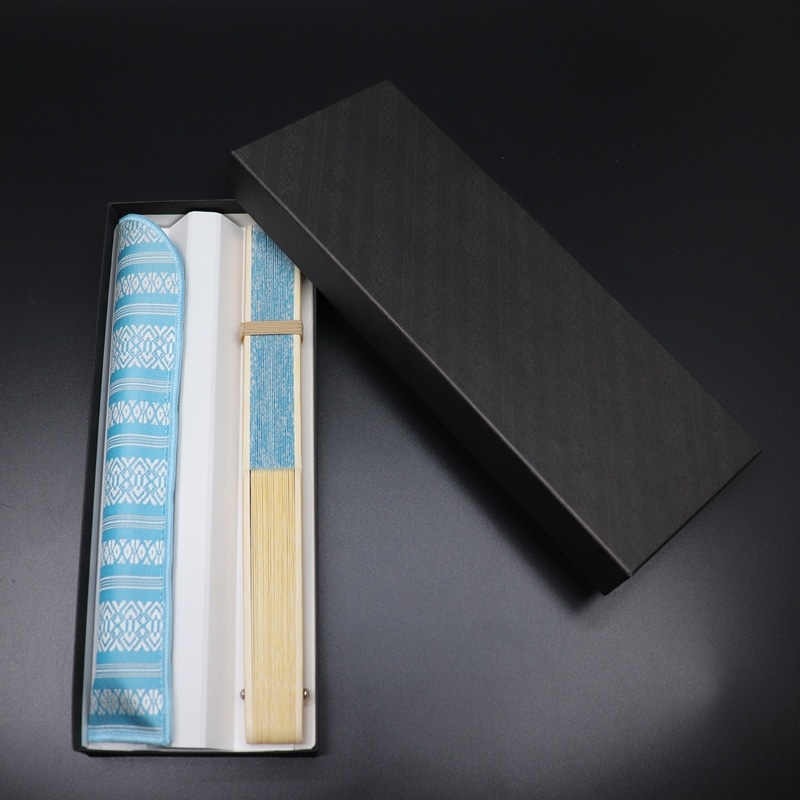 博多織の代表的な献上柄を織り込んだ絹100%の生地は軽く極薄ながらも破れにくく、 博多織ならではの「しなやかで丈夫」という特性が しっかりと活かされ日常使いはもちろん、 長くご愛用いただける商品です。 扇子入れもセットになっており、持ち運びやすく便利です。