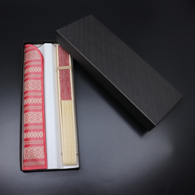 博多織の代表的な献上柄を織り込んだ絹100%の生地は軽く極薄ながらも破れにくく、 博多織ならではの「しなやかで丈夫」という特性が しっかりと活かされ日常使いはもちろん、 長くご愛用いただける商品です。 扇子入れもセットになっており、持ち運びやすく便利です。
