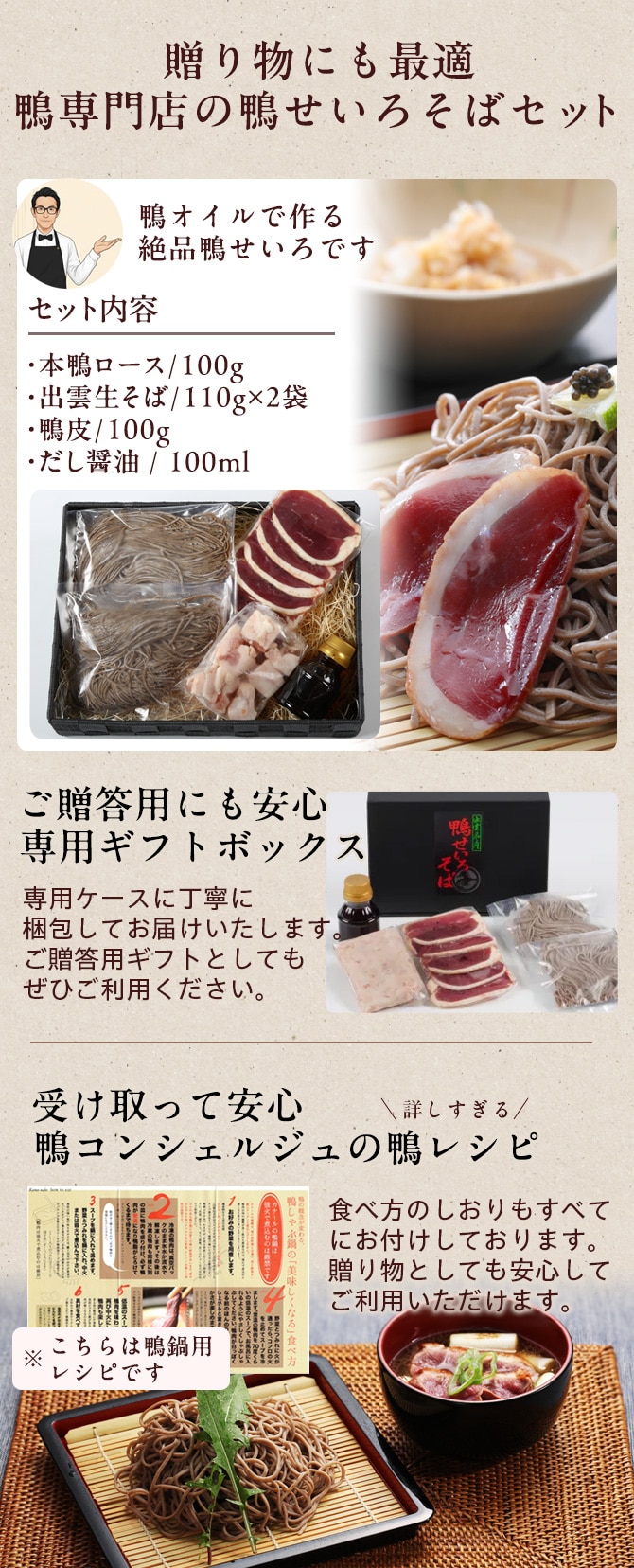 濃厚な鴨だしにくぐらせるつけ麺風。たっぷりの鴨脂に、昆布・鰹・椎茸の三大旨み成分を加えた絶品のだしが自慢です。鴨専門店のこだわりレシピで本格派鴨せいろをお楽しみください。 [お歳暮 お中元 ギフト プレゼント]