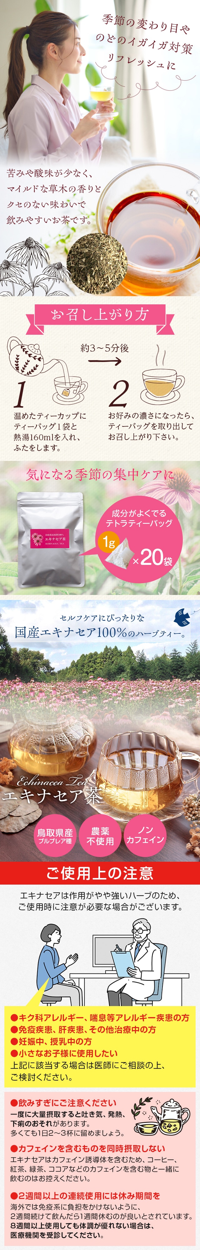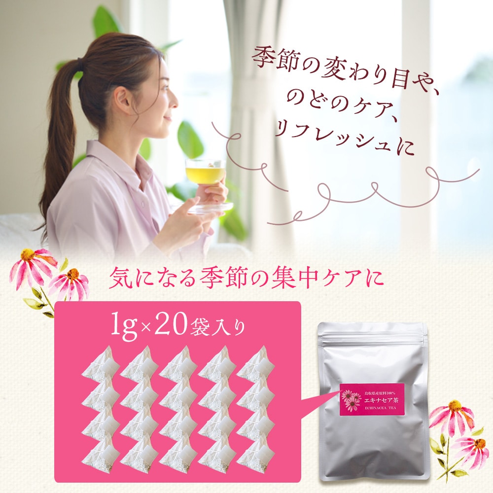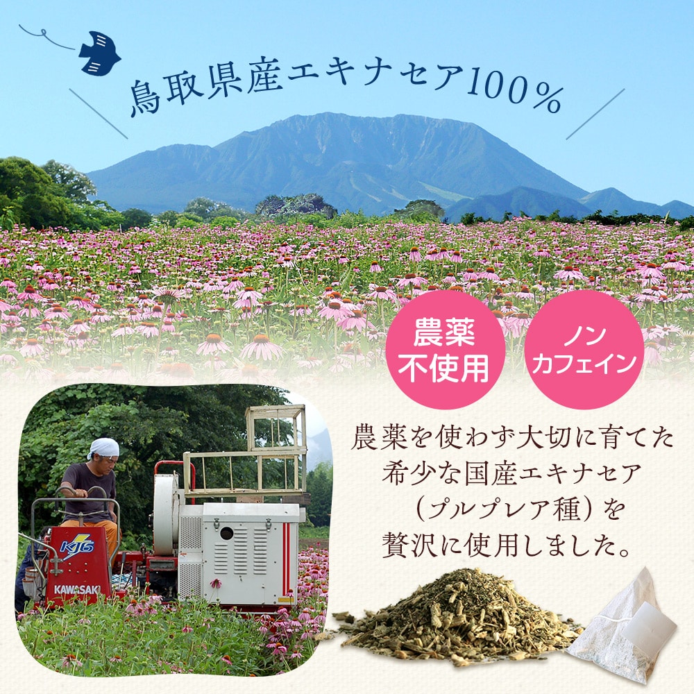 世界中で愛されるエキナセア茶の中でも希少な、鳥取県産原料100%使用。農薬を使わず大切に育てたエキナセアを便利なティーバッグに詰めました。寒い時期にはもちろん、普段からの体調管理やリフレッシュにも取り入れたいハーブティーです。
