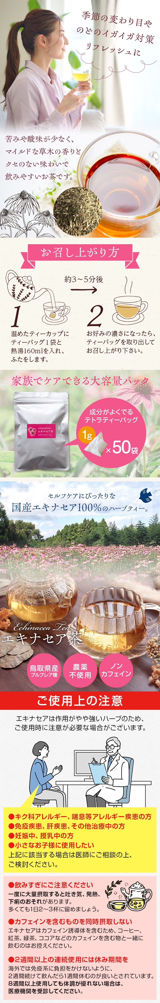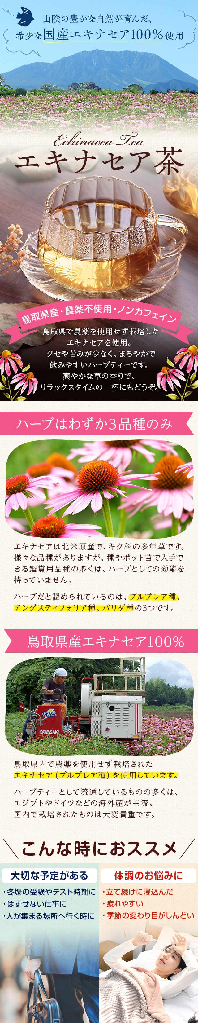 世界中で愛されるエキナセア茶の中でも希少な、鳥取県産原料100%使用。農薬を使わず大切に育てたエキナセアを便利なティーバッグに詰めました。寒い時期にはもちろん、普段からの体調管理やリフレッシュにも取り入れたいハーブティーです。