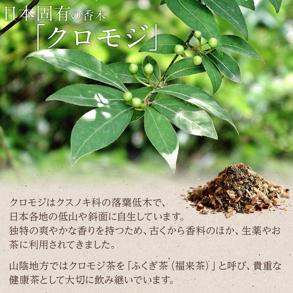 山陰地方では縁起の良い「福来茶」として古くから伝わり、傷薬など民間療法にも使用されてきたクロモジ茶。最大の特長であるその独特で高貴な香りが、まるで森にいるような爽やかさであなたを優しく包みます。心も体もリフレッシュしたい、そんな時にピッタリの1杯です。原料のクロモジは全て島根県で自生しているものを採集し、手作業で丁寧に茶葉に仕上げています。
