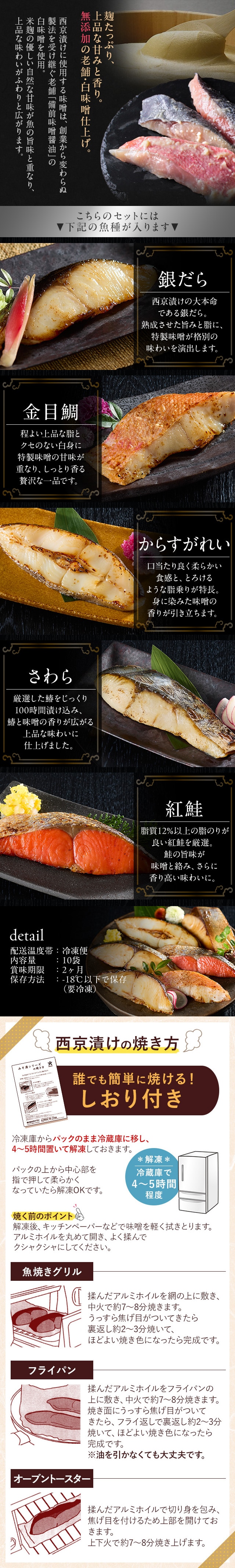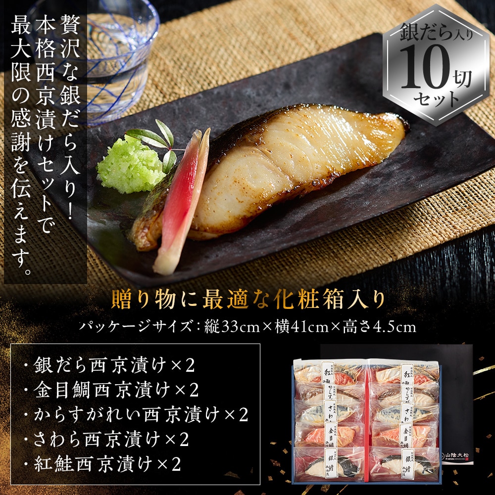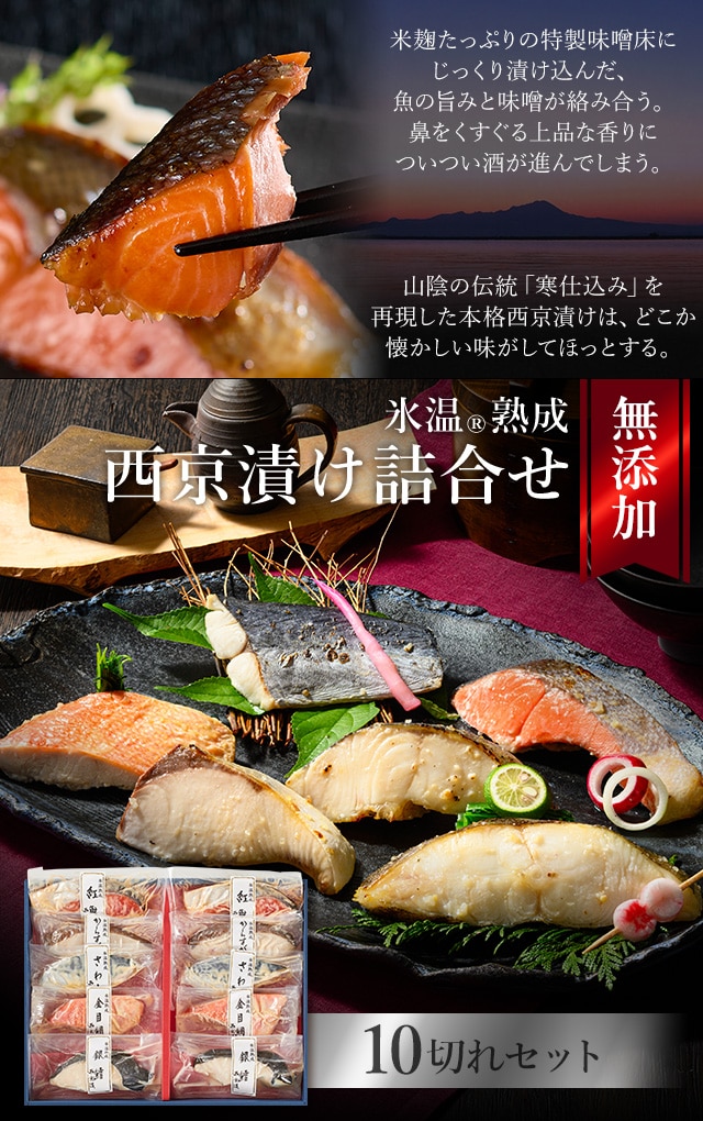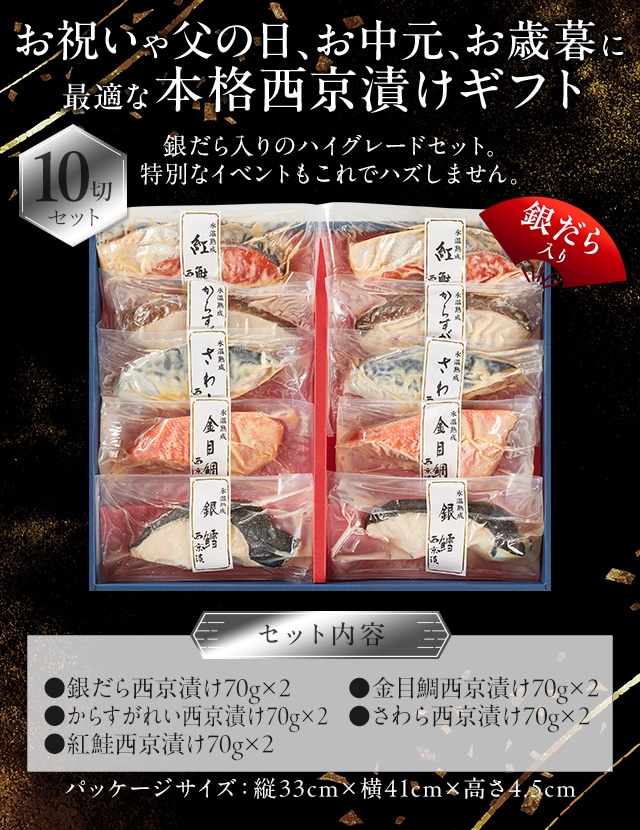 氷温熟成で魚と味噌の旨みを閉じ込めた銀だら入りの豪華な西京漬け。一番美味しい時期の魚を厳選し、魚種に合わせた特製味噌床に漬け込みました。父の日やお歳暮など贈り物にも喜ばれる特別なギフトセットです。 [用途/シーン]父の日プレゼント 母の日プレゼント 敬老の日プレゼント お中元ギフト お歳暮ギフト プレゼント ギフト