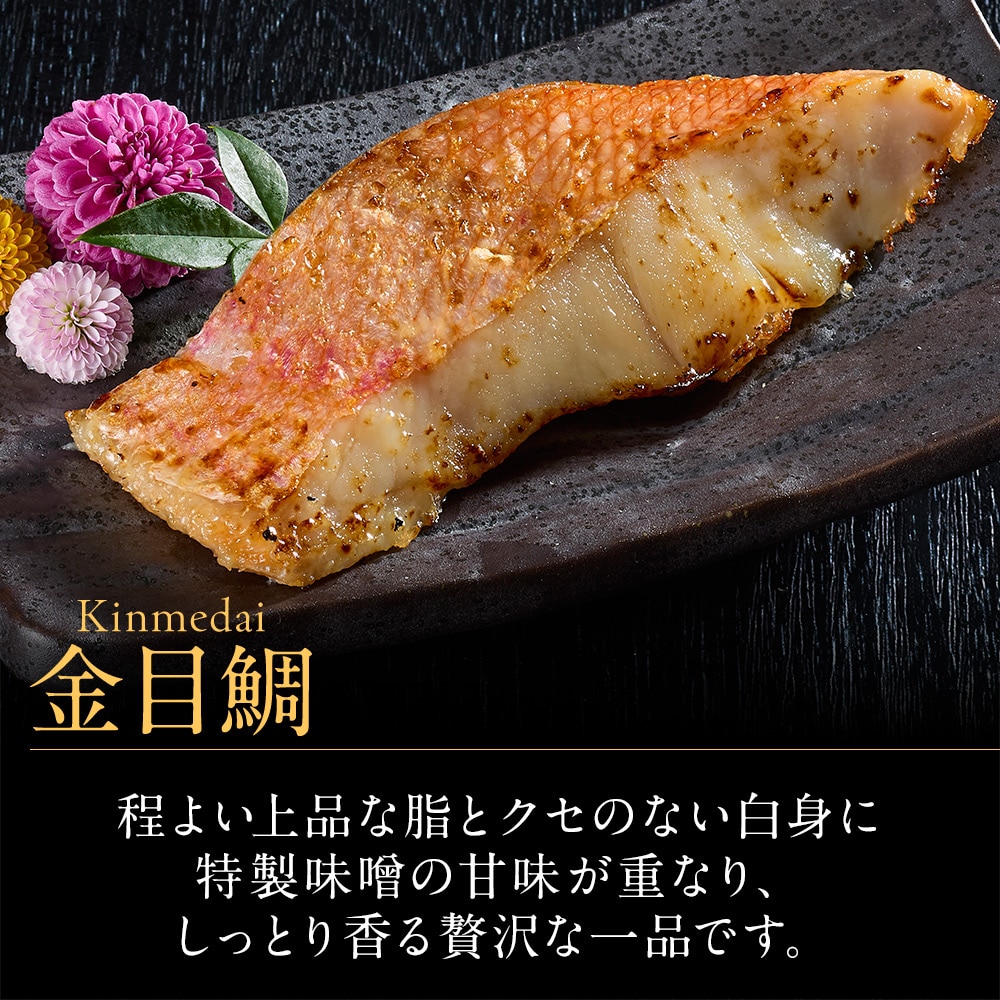 【金目鯛西京漬け】キンメダイ(ニュージーランド)、みそ(大豆を含む)、調味粕(酒粕、還元水あめ、食塩)、砂糖結合水あめ、発酵調味料、砂糖、食塩