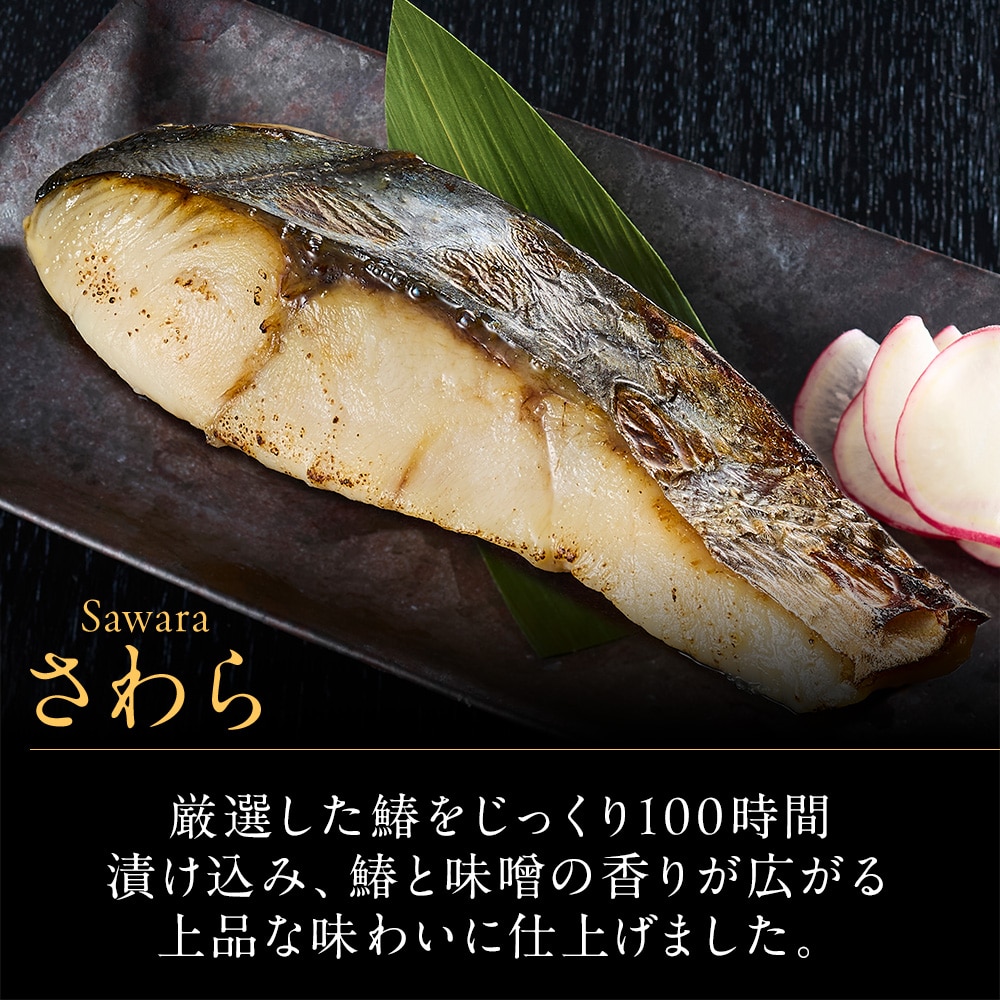 【さわら西京漬け】サワラ(韓国)、みそ(大豆を含む)、調味粕(酒粕、還元水あめ、食塩)、砂糖結合水あめ、発酵調味料、砂糖、食塩