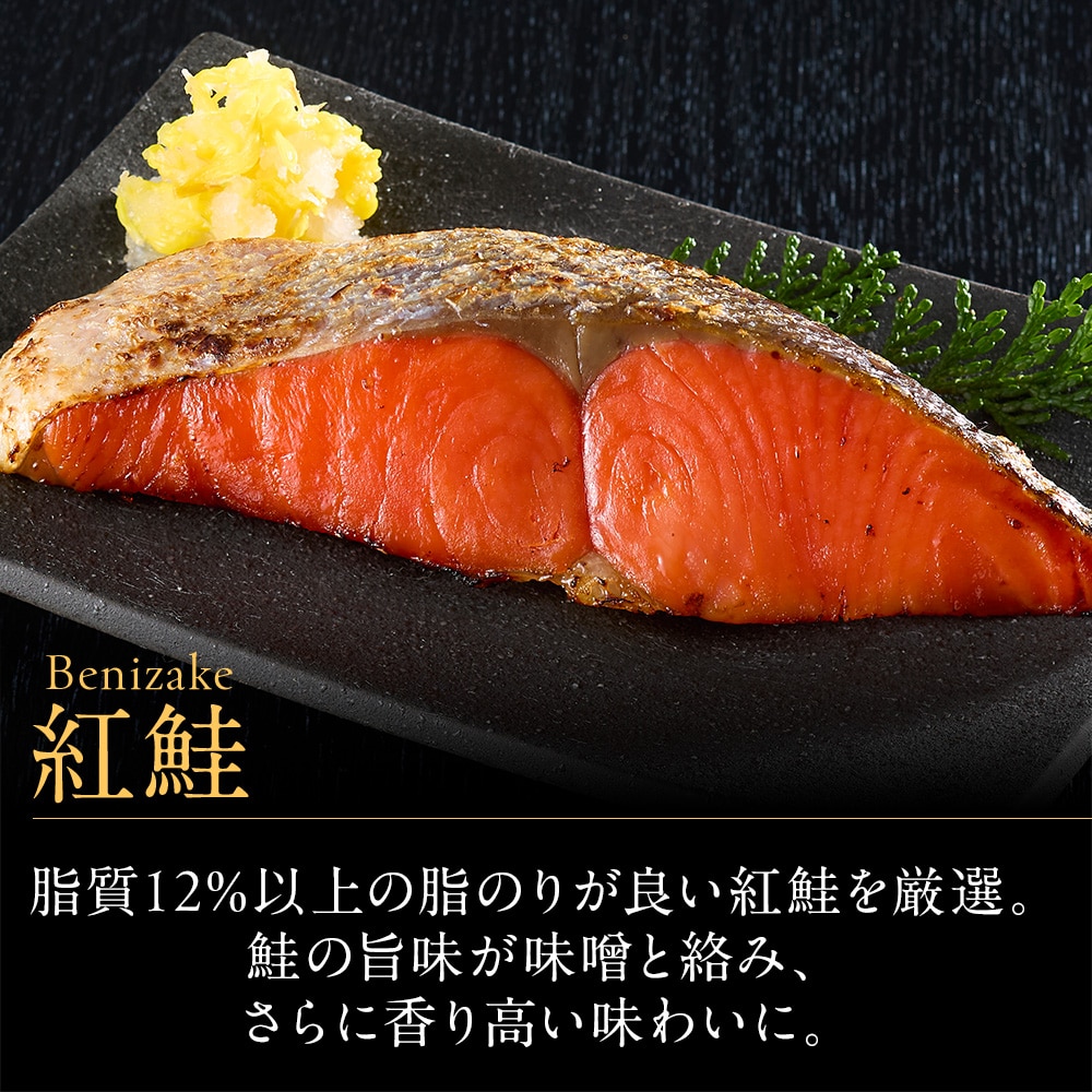 【紅鮭西京漬け】ベニザケ(アメリカ)、みそ(大豆を含む)、調味粕(酒粕、還元水あめ、食塩)、砂糖結合水あめ、発酵調味料、砂糖、食塩
