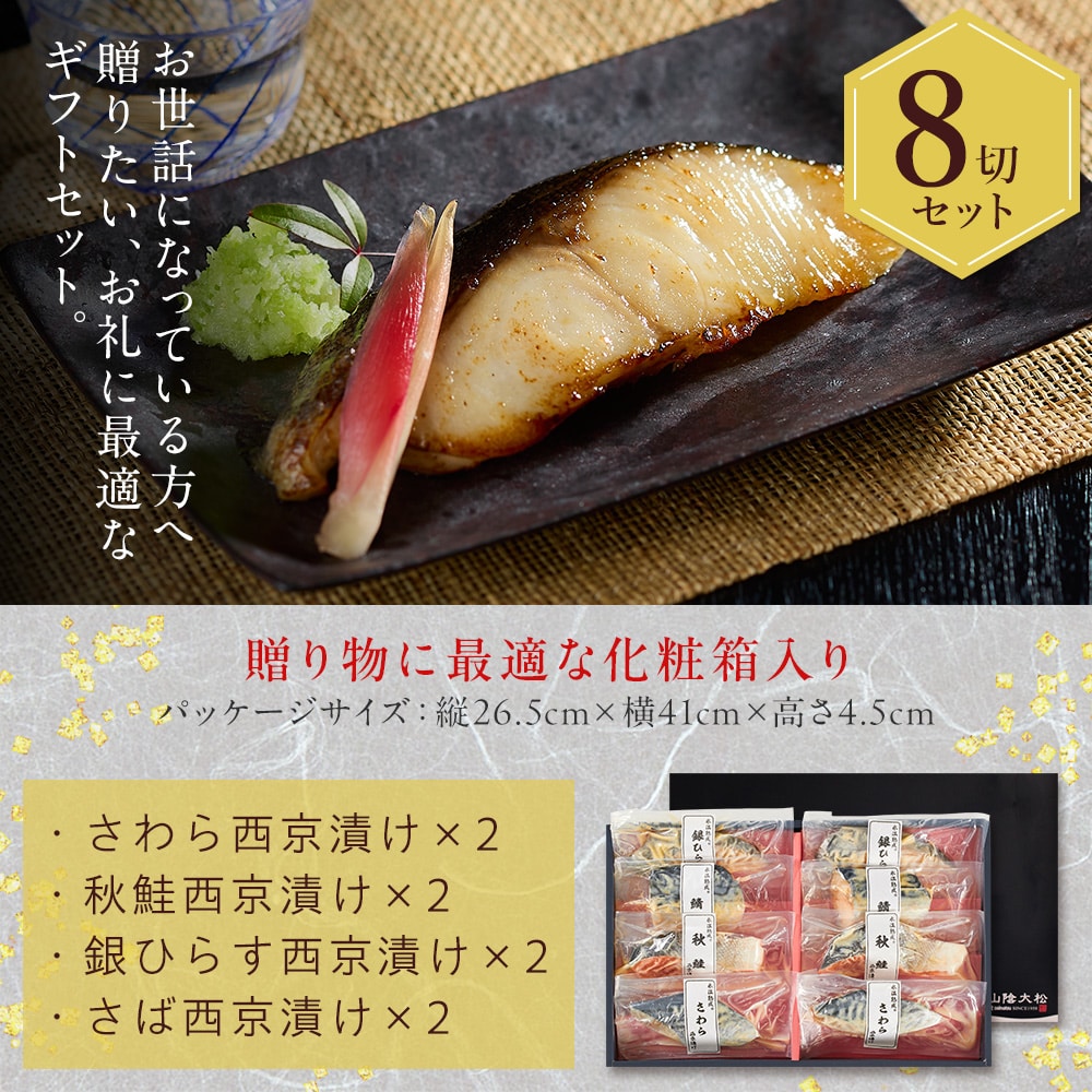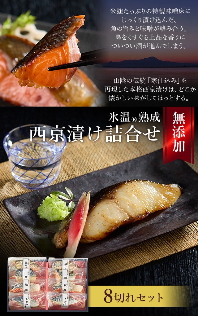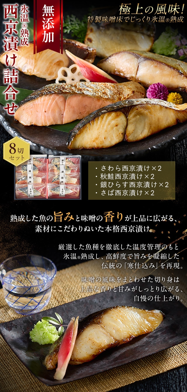 氷温熟成で魚と味噌の旨みを閉じ込めた本格西京漬け。一番美味しい時期の魚を厳選し、魚種に合わせた特製味噌床に漬け込みました。父の日やお歳暮など贈り物にも喜ばれる特別なギフトセットです。 [用途/シーン]父の日プレゼント 母の日プレゼント 敬老の日プレゼント お中元ギフト お歳暮ギフト プレゼント ギフト