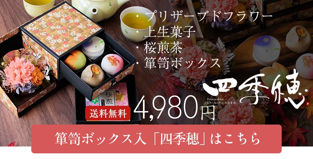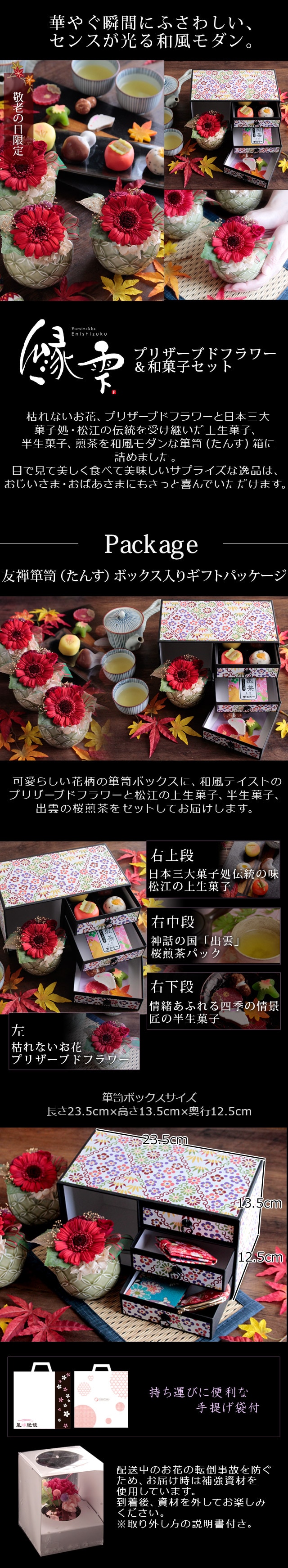 枯れないお花のプリザーブドフラワーと日本三大菓子処「松江」の伝統文化を受け継ぐ上生菓子、半生菓子、桜煎茶を和風モダンな箪笥(たんす)箱に詰めました。華やいだひとときを演出する逸品で、日ごろの感謝をお届けします。※母の日と敬老の日向けに、季節の移ろいを反映した上生・半生菓子を都度替えて販売しております(3月・8月の年2回を予定/最新更新日2025.8.1)。 [母の日 敬老の日 ギフト プレゼント 花とスイーツ セット ランキング 30代 40代 50代 60代 70代 80代 90代]