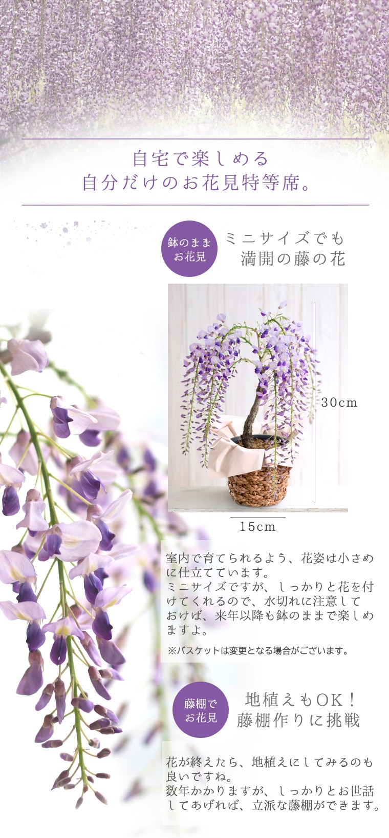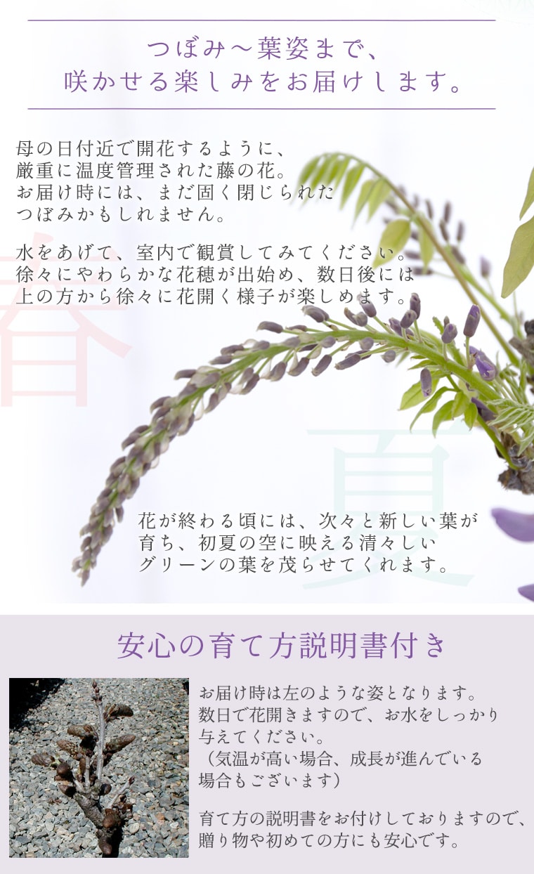 鉢植えで小さく開花する藤の品種「一才藤」。紫色の花が枝垂れて咲く様を楽しめます。花後の柔らかな黄緑色の葉も爽やかで美しいと評判です。つぼみの状態でのお届けとなります。