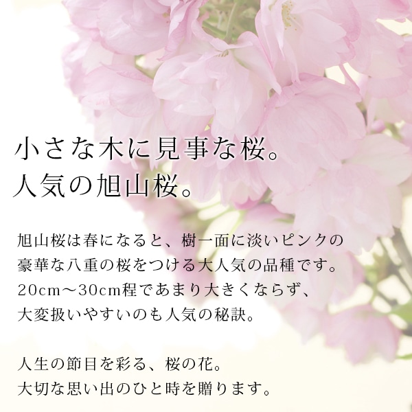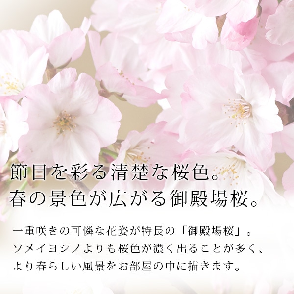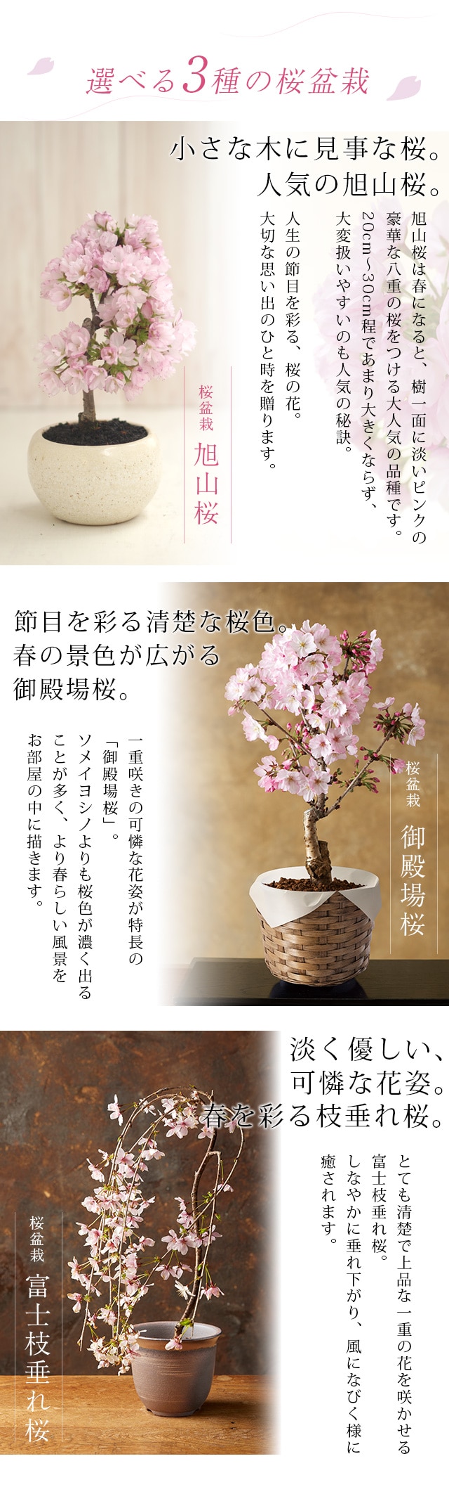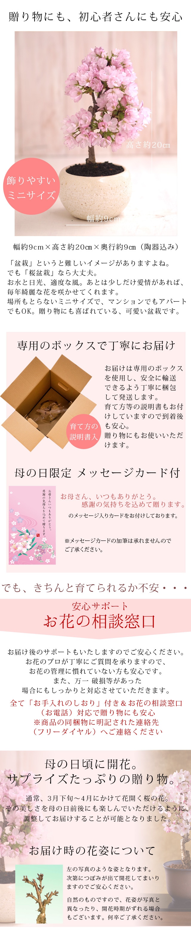 その美しい姿で、はるか昔から日本人の心を引き付けてやまない桜。通常よりも開花を遅らせた母の日用でサプライズギフトに。儚いながらも美しい瞬間をご家庭でお楽しみいただけるよう、ミニサイズの桜盆栽に仕立てました。