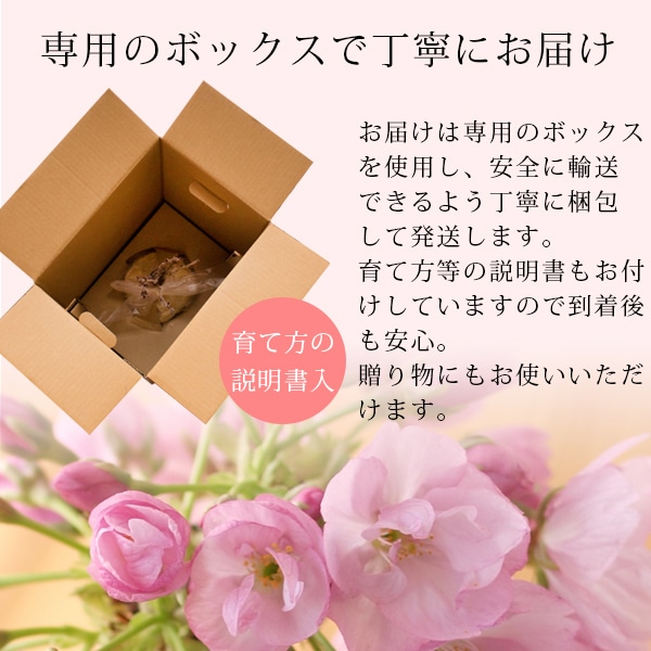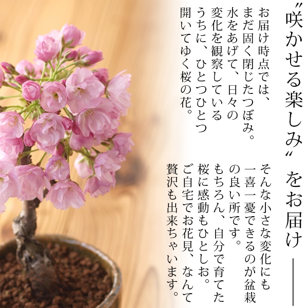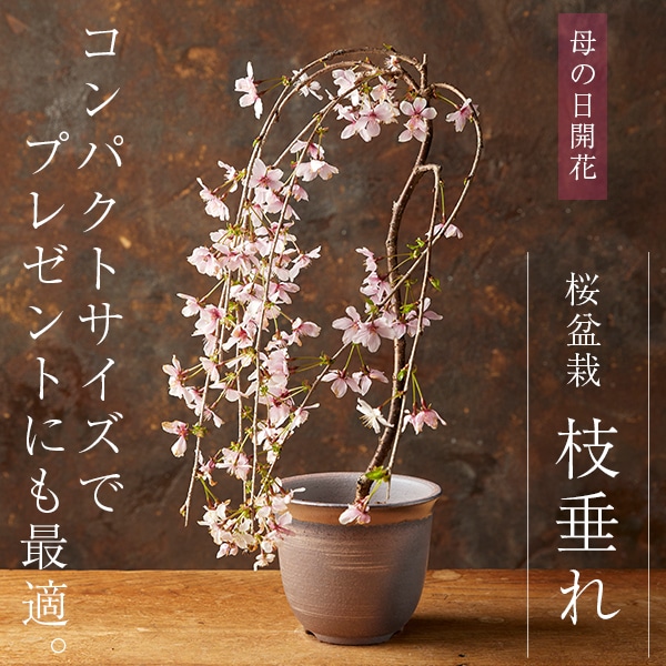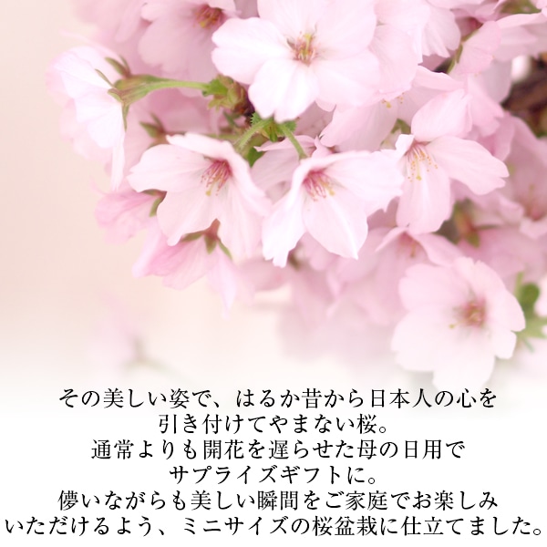 その美しい姿で、はるか昔から日本人の心を引き付けてやまない桜。通常よりも開花を遅らせた母の日用でサプライズギフトに。儚いながらも美しい瞬間をご家庭でお楽しみいただけるよう、ミニサイズの桜盆栽に仕立てました。