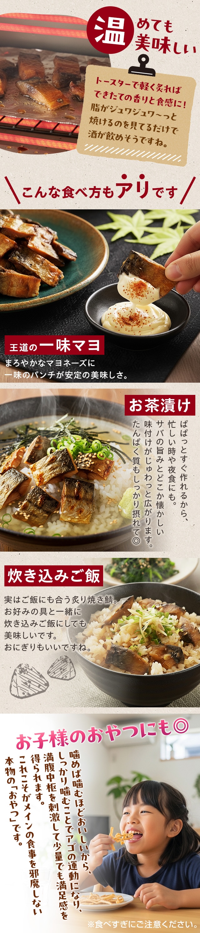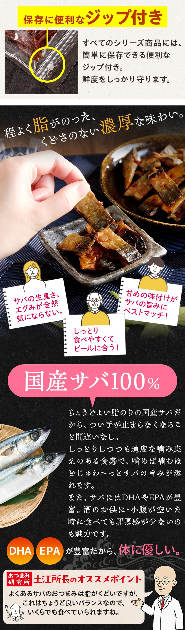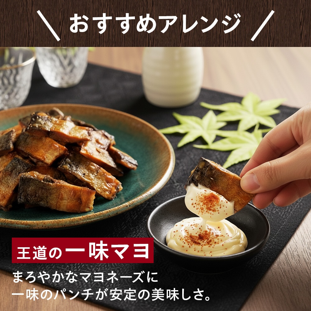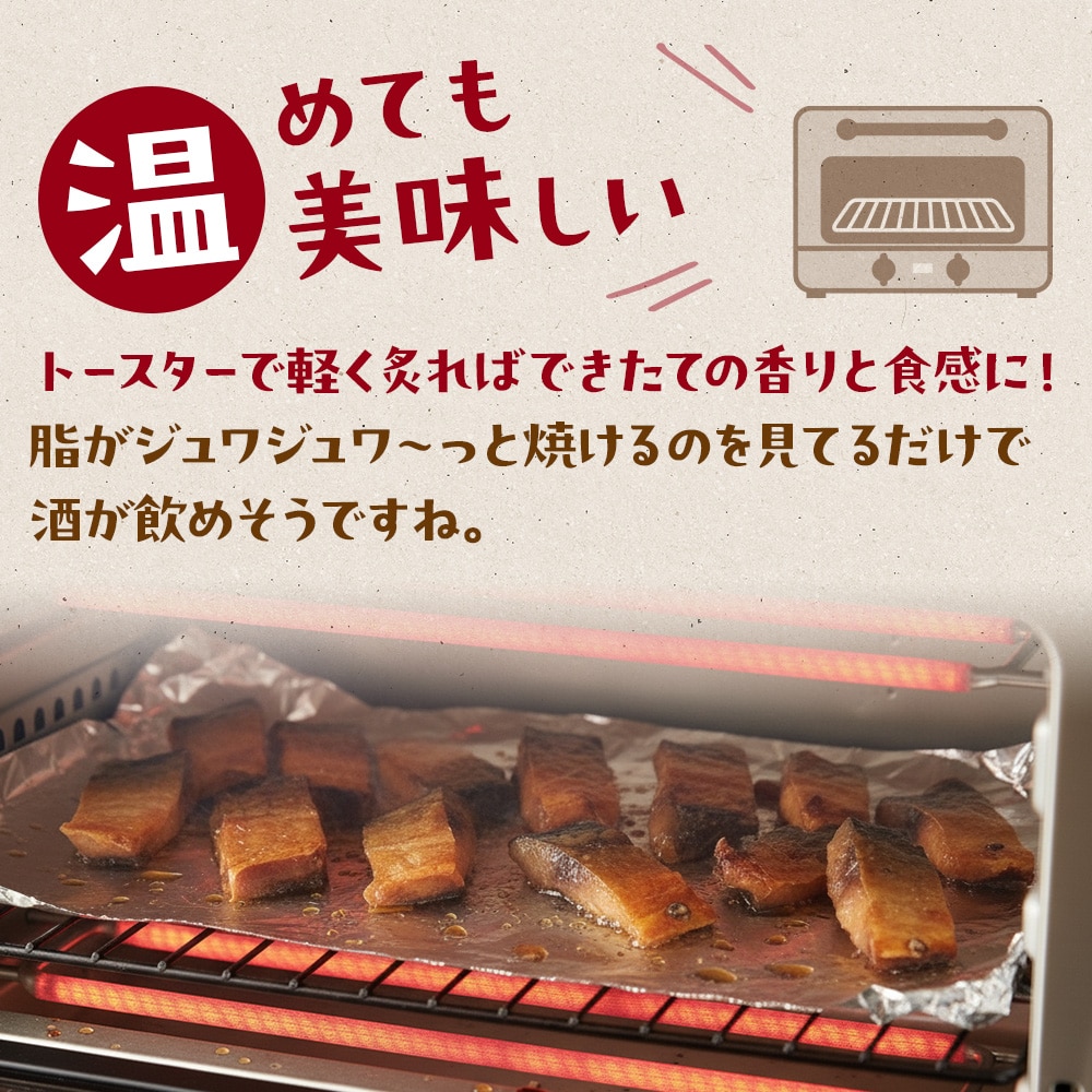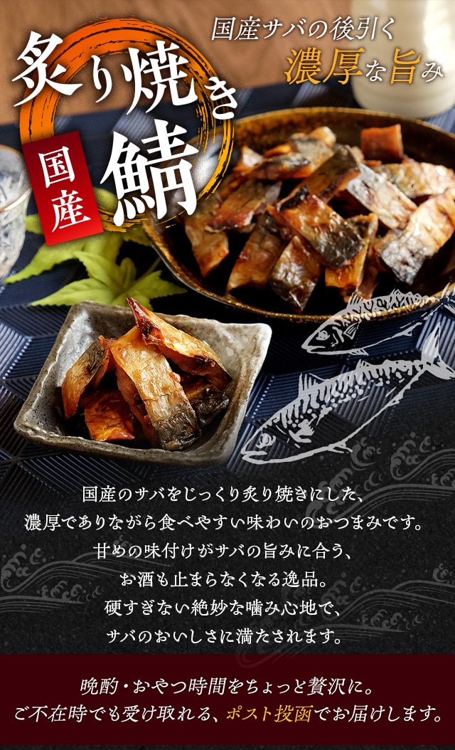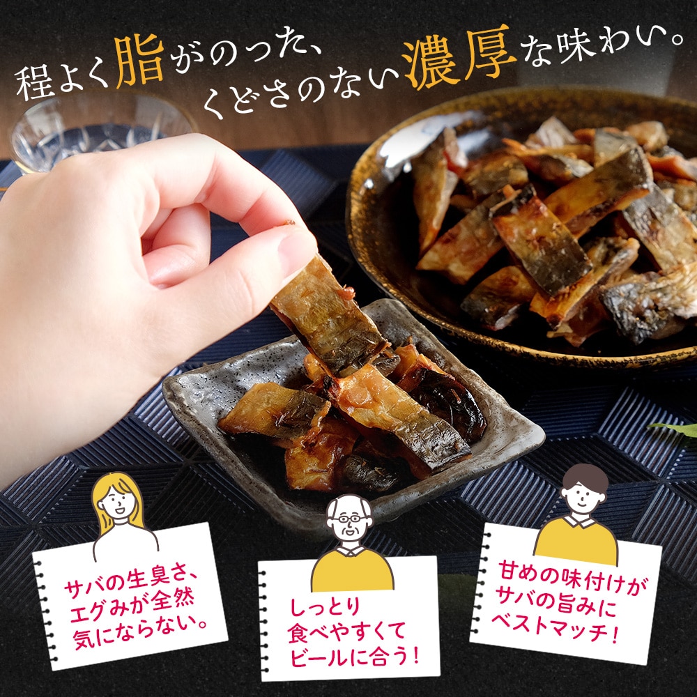 国産サバをじっくり炙り焼きにした、ほど良い脂のりと甘めの味付けがサバの旨みに合う、ビールにぴったりのおつまみです。しっとり食感で食べやすく、生臭さやエグみも気になりません。噛みしめるたびに濃厚なサバの旨みが広がります。