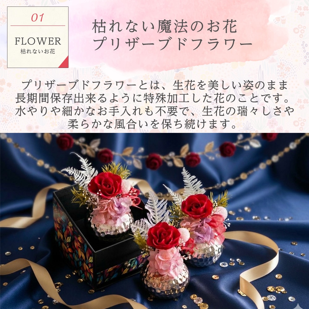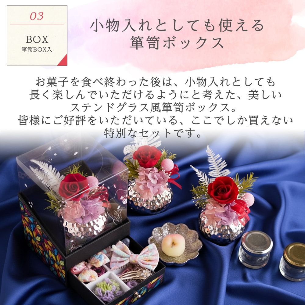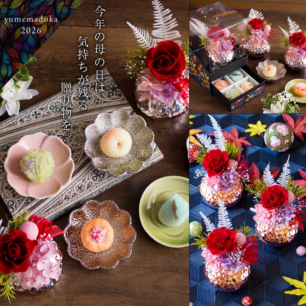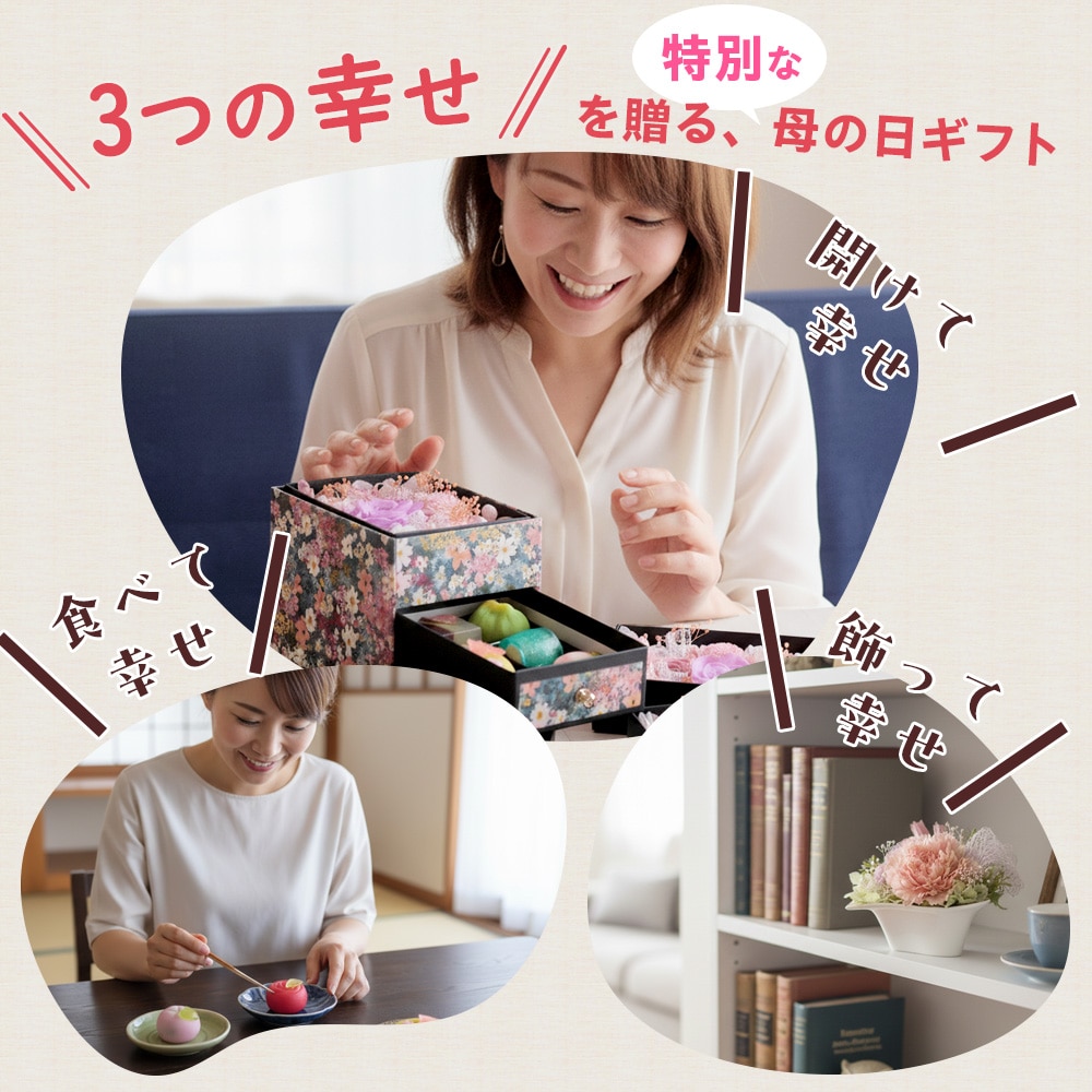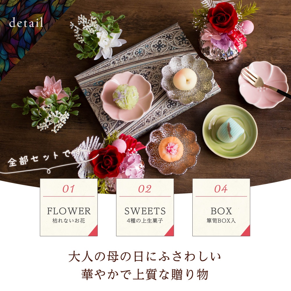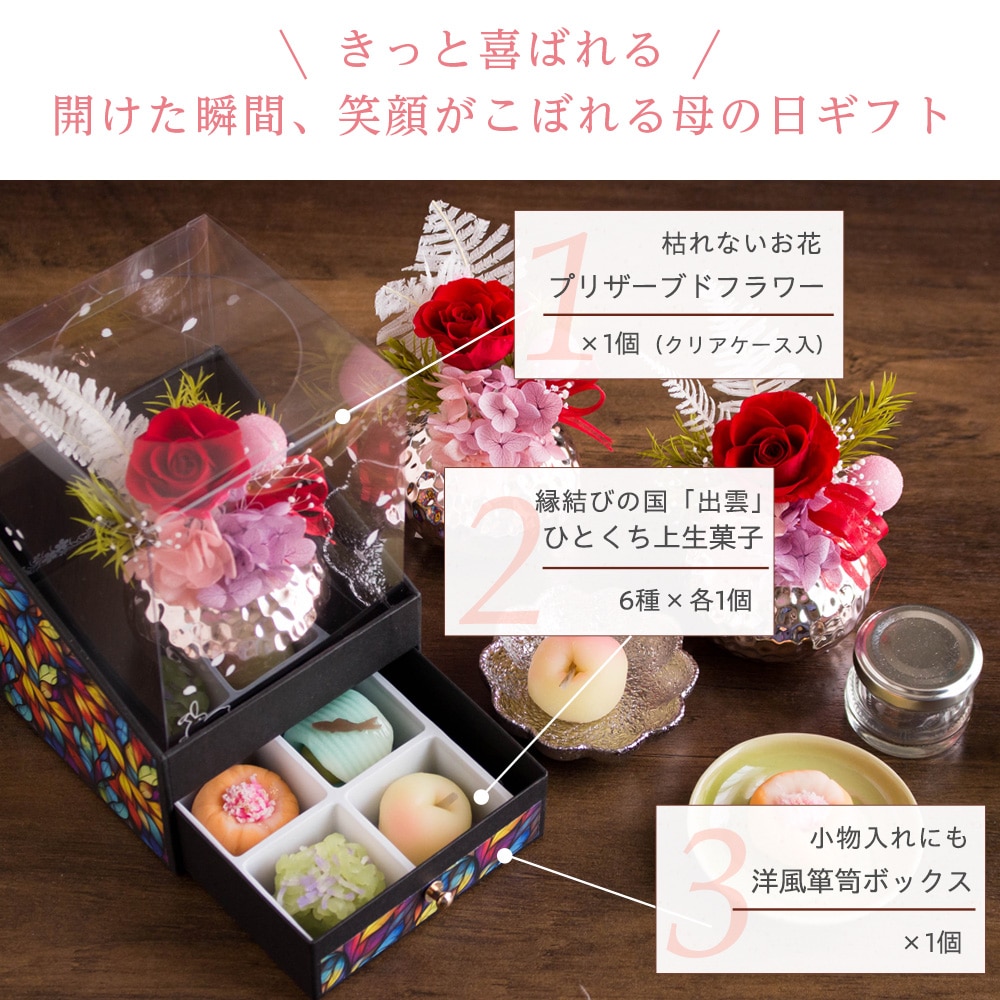 和洋折衷が美しい人気の母の日ギフト。金色の友禅に染められたクリアウィンドウ箪笥ボックスに、和風プリザーブドフラワーと出雲国の上生菓子をセットしました。見て良し・食べて良し・使って良しと色々楽しめるのが大きな魅力。大切な方への贈り物としておすすめです。※母の日と敬老の日向けに、季節の移ろいを反映した上生菓子を都度替えて販売しております(3月・8月の年2回を予定/最新更新日2026.3.4)。 [母の日 敬老の日 ギフト プレゼント 花とスイーツ セット ランキング 30代 40代 50代 60代 70代 80代 90代]