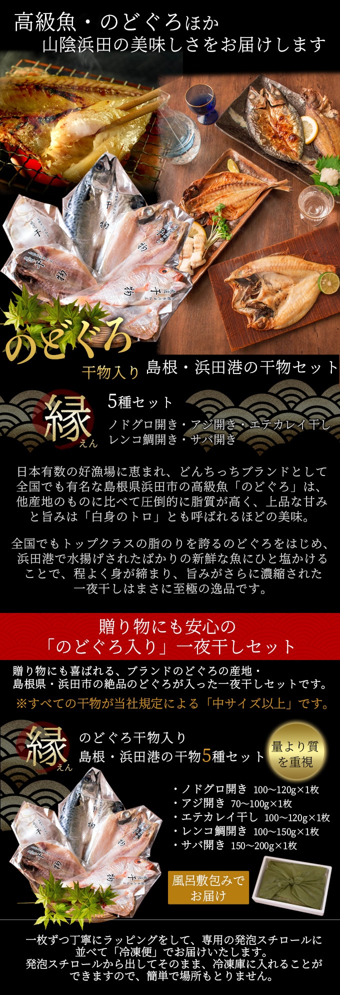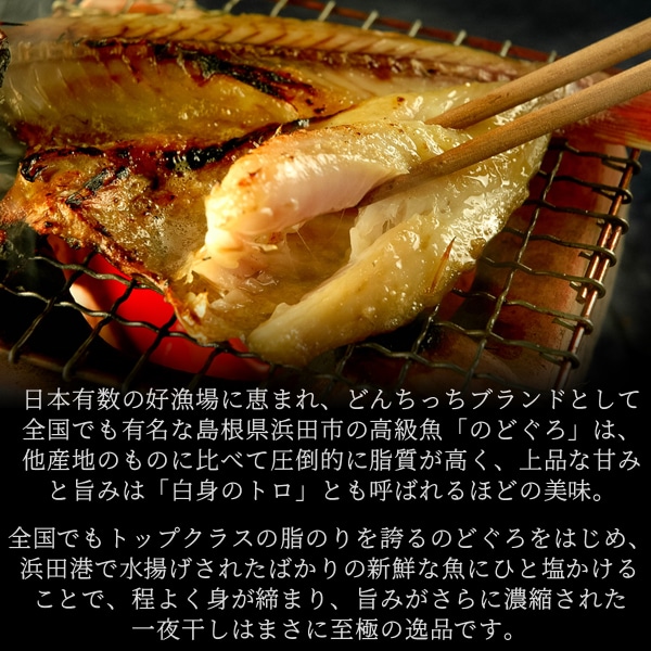日本有数の好漁場に恵まれ、どんちっちブランドとして全国でも有名な島根県浜田市の高級魚「のどぐろ」は、他産地のものに比べて脂質が高く、上品な甘みと旨みは「白身のトロ」とも呼ばれるほどの美味。全国でもトップクラスの脂のりを誇るのどぐろをはじめ、浜田港で水揚げされた魚にひと塩かけることで程よく身が締まり、旨みがさらに凝縮された一夜干しはまさに至極の逸品です。 [父の日 母の日 敬老の日 お歳暮 お中元 ギフト プレゼント 50代 60代 70代 80代]