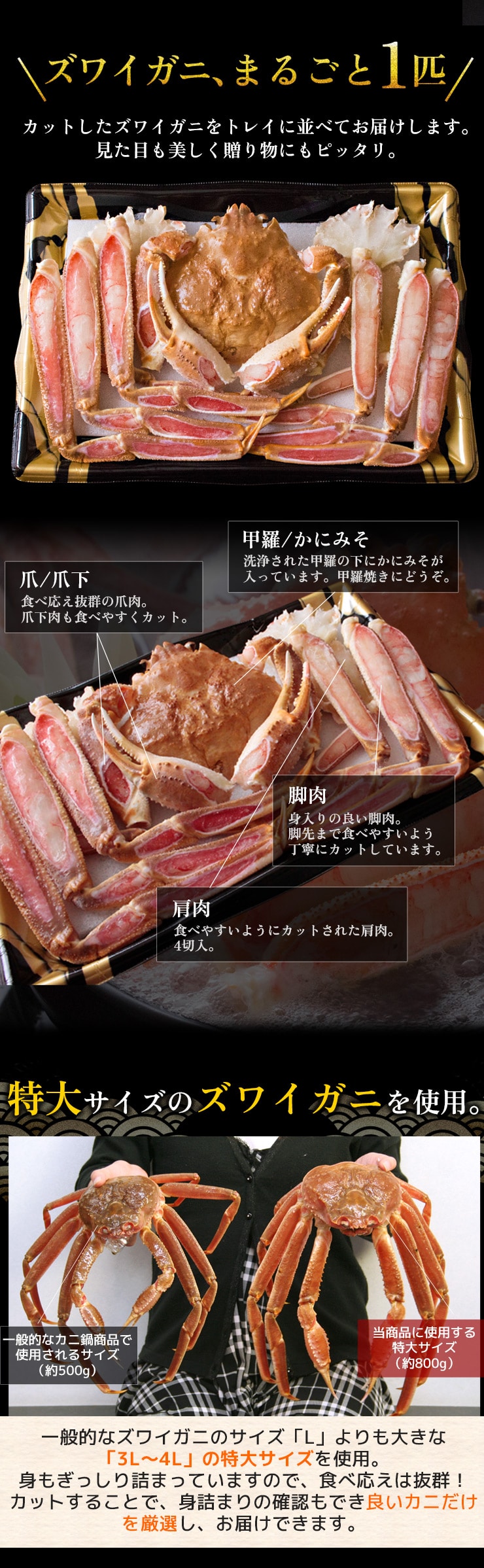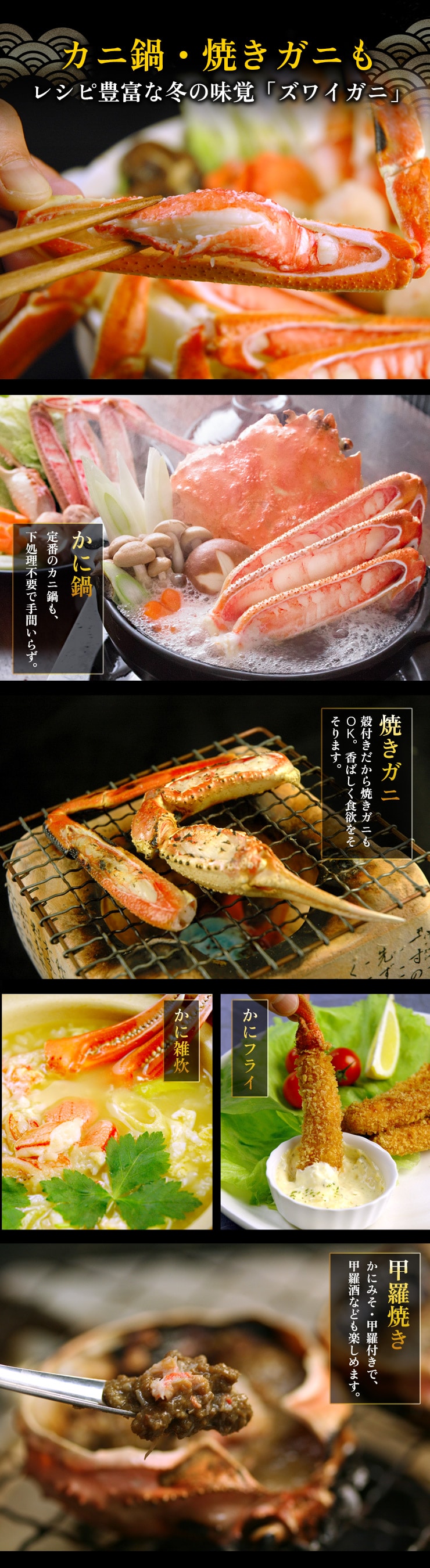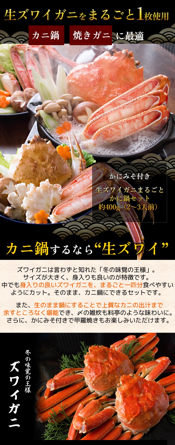 ズワイガニは言わずと知れた「冬の味覚の王様」。サイズが大きく、身入りも良いのが特徴です。中でも身入りの良いズワイガニを、まるごと一匹分食べやすいようにカット。そのまま、カニ鍋にできるセットです。また、生のまま鍋にすることで上質なカニの出汁まで余すところなく堪能でき、〆の雑炊も料亭のような味わいに。さらに、かにみそ付きで甲羅焼きもお楽しみいただけます。 [お歳暮ギフト お中元ギフト 父の日プレゼント 母の日プレゼント 敬老の日プレゼント プレゼント ギフト]