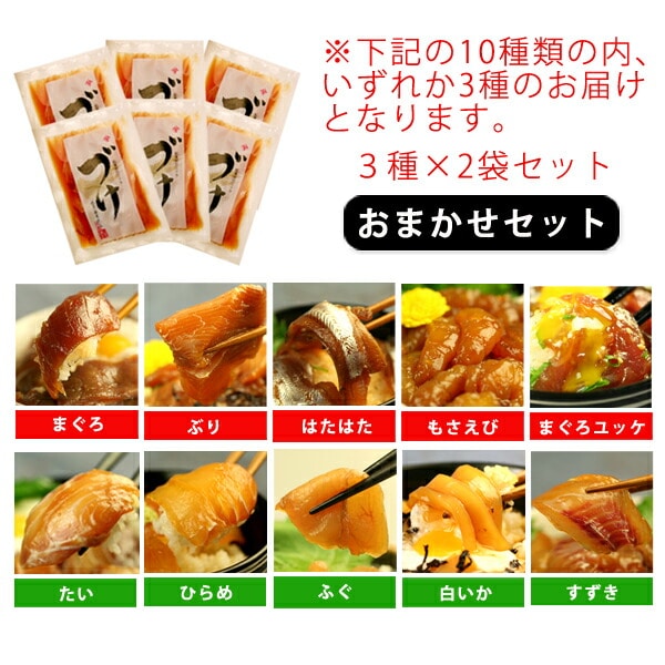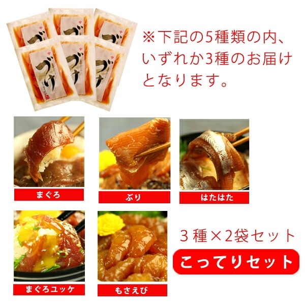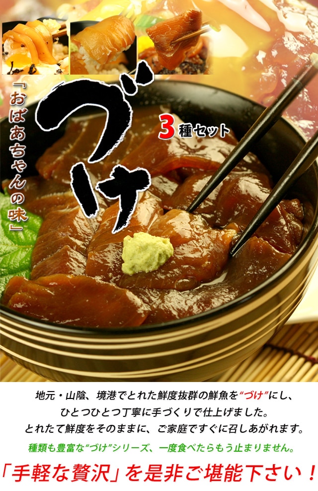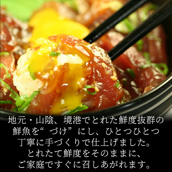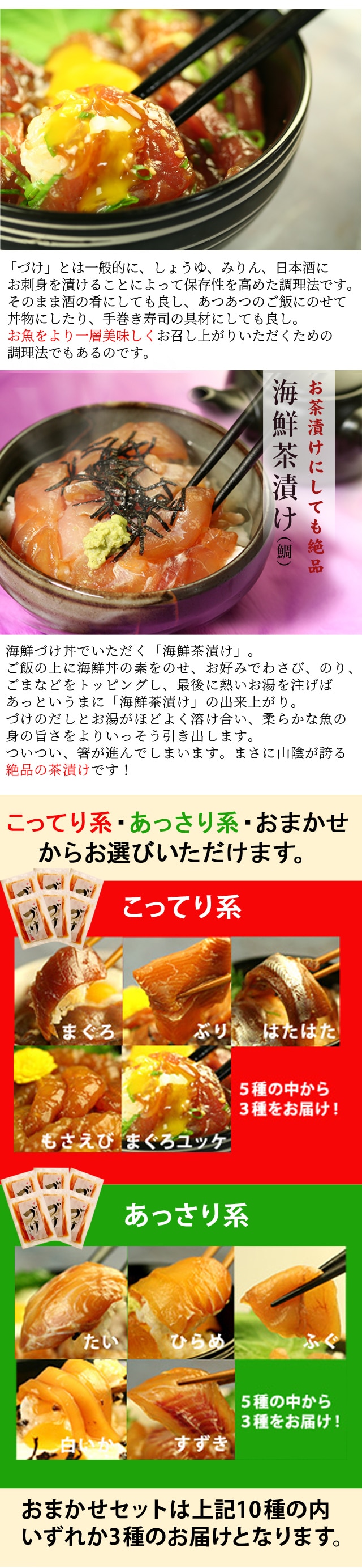 日本海の天然地魚が計10種。鮮度抜群の鮮魚を“づけ”にした本格丼セットです(こってりセットは「まぐろ」「ぶり」「はたはた」「もさえび」「まぐろユッケ」の5種の内いずれか3種、あっさりセットは「たい」「ひらめ」「ふぐ」「白いか」「すずき」の5種の内いずれか3種、おまかせセットはこってりとあっさりの計10種の内いずれか3種のお届けとなります)。 [父の日 母の日 敬老の日 お歳暮 お中元 ギフト プレゼント 50代 60代 70代 80代]