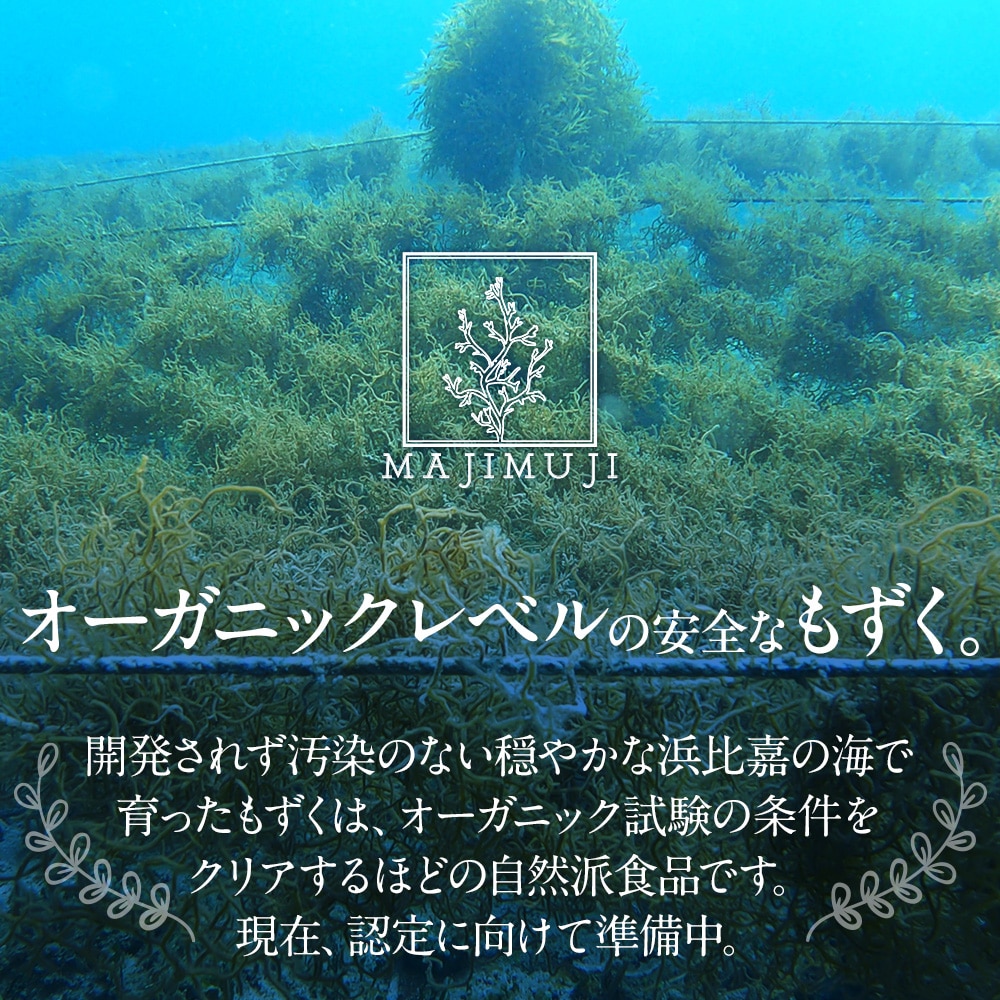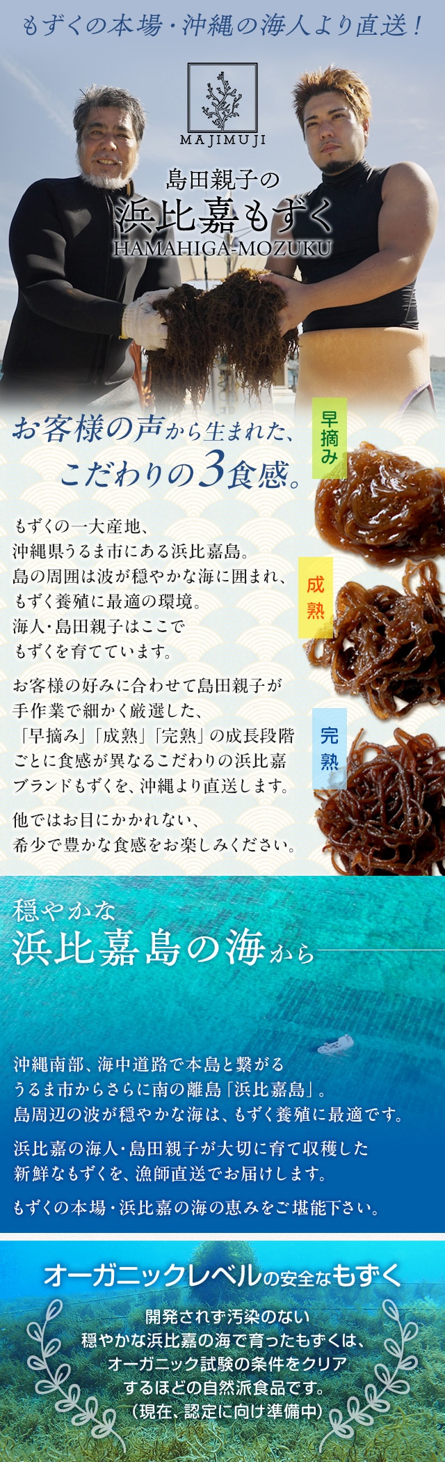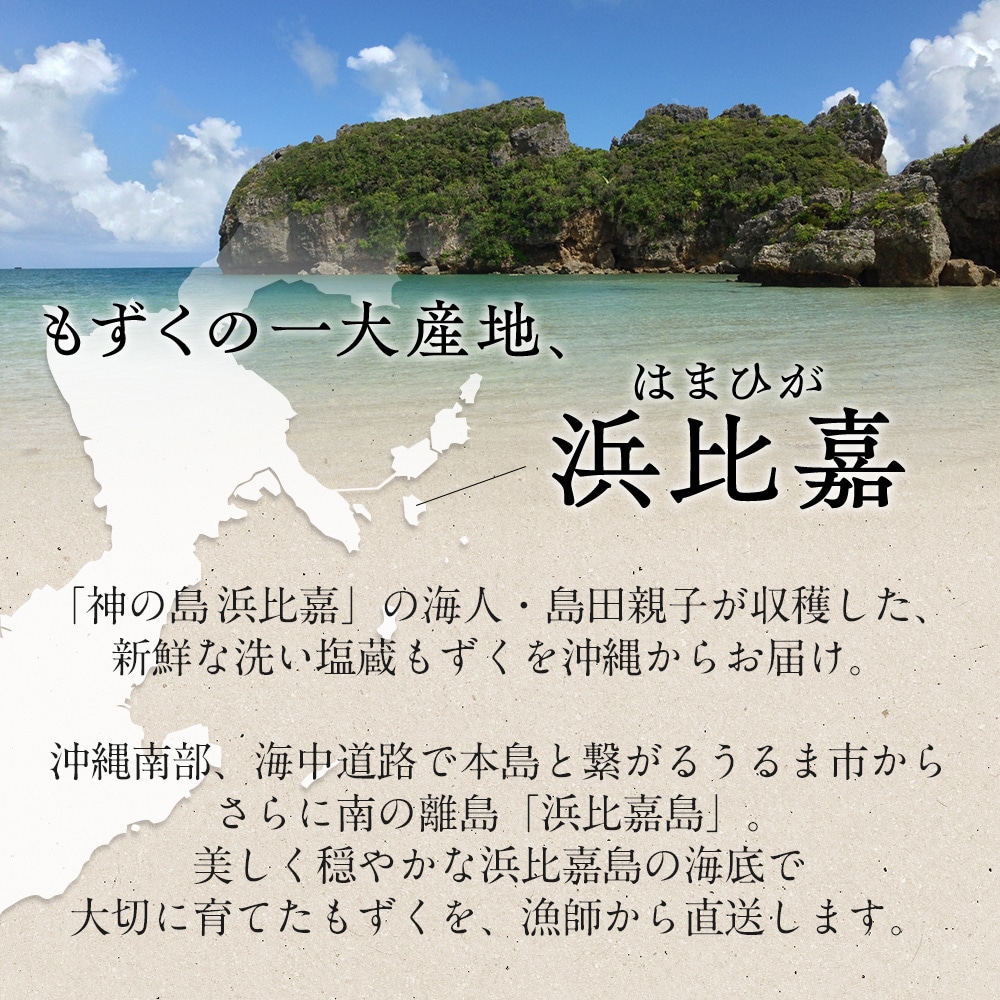 もずくの一大産地・沖縄県浜比嘉島。島の周囲は波が穏やかできれいな海に囲まれ、もずく養殖に最適な環境がそろっています。海人の島田親子がお届けする、成長段階ごとに食感が異なるこだわりの浜比嘉ブランドもずく。塩蔵でありながら塩抜き不要(塩分10%)で、そのままお召し上がりいただけます。シャキシャキ・コリコリの「完熟」は歯ごたえの良さが自慢。幅広いお料理はもちろん、そうめんやラーメンなど麺代わりにどうぞ。