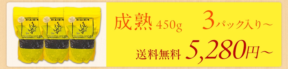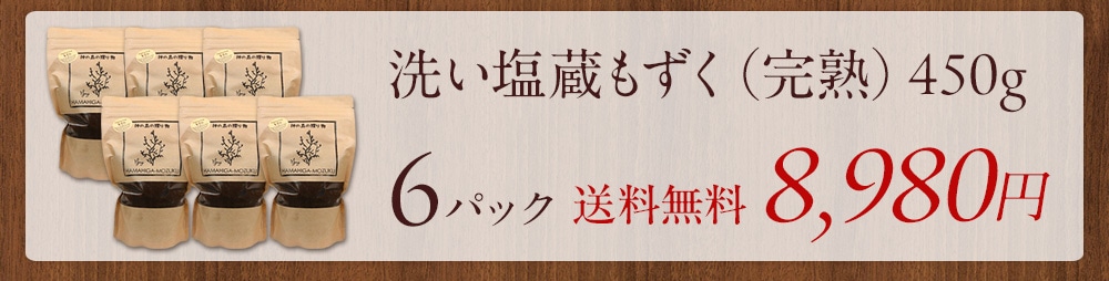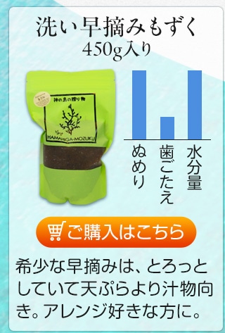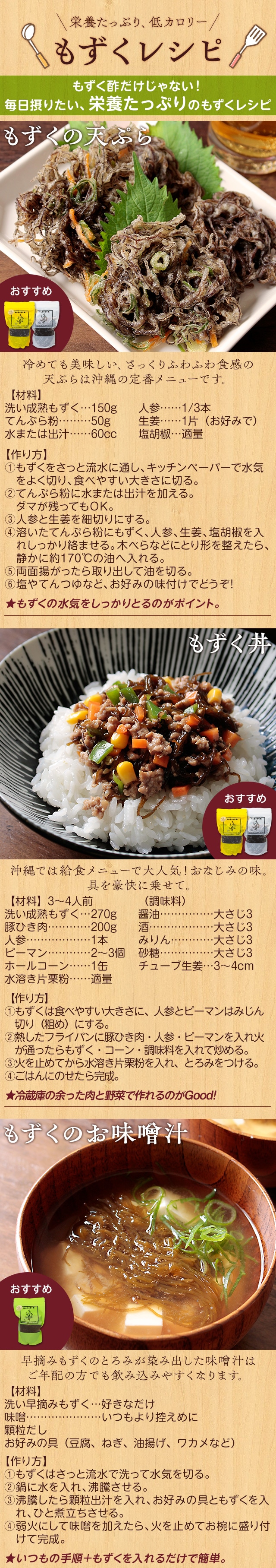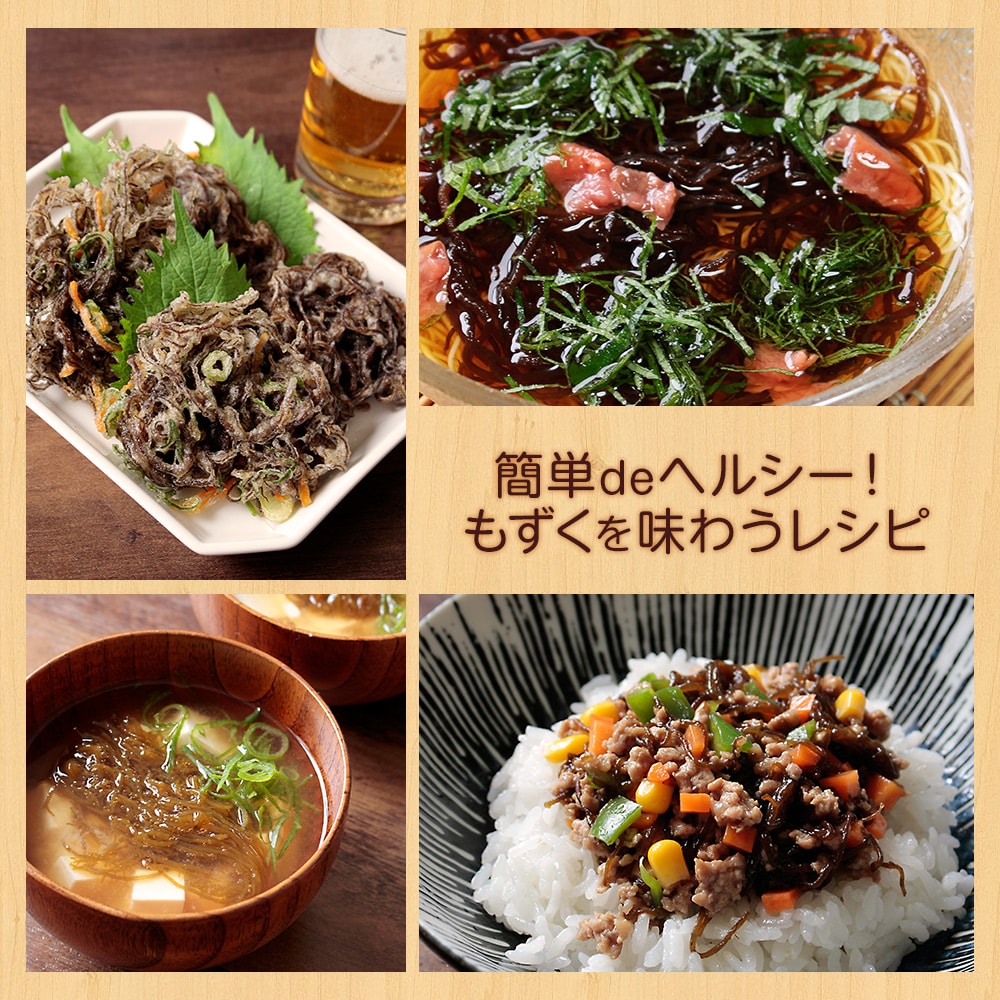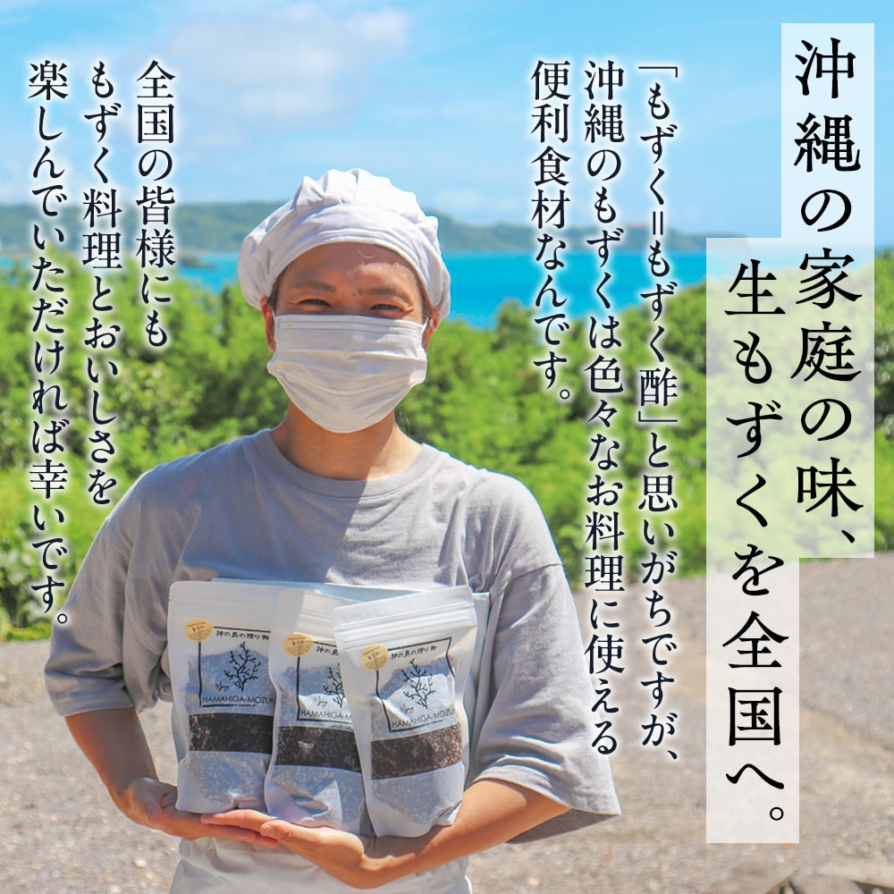 もずくの一大産地・沖縄県浜比嘉島。島の周囲は波が穏やかできれいな海に囲まれ、もずく養殖に最適な環境がそろっています。海人の島田親子がお届けする、成長段階ごとに食感が異なるこだわりの浜比嘉ブランドもずく。塩蔵でありながら塩抜き不要(塩分10%)で、そのままお召し上がりいただけます。シャキシャキ・コリコリの「完熟」は歯ごたえの良さが自慢。幅広いお料理はもちろん、そうめんやラーメンなど麺代わりにどうぞ。