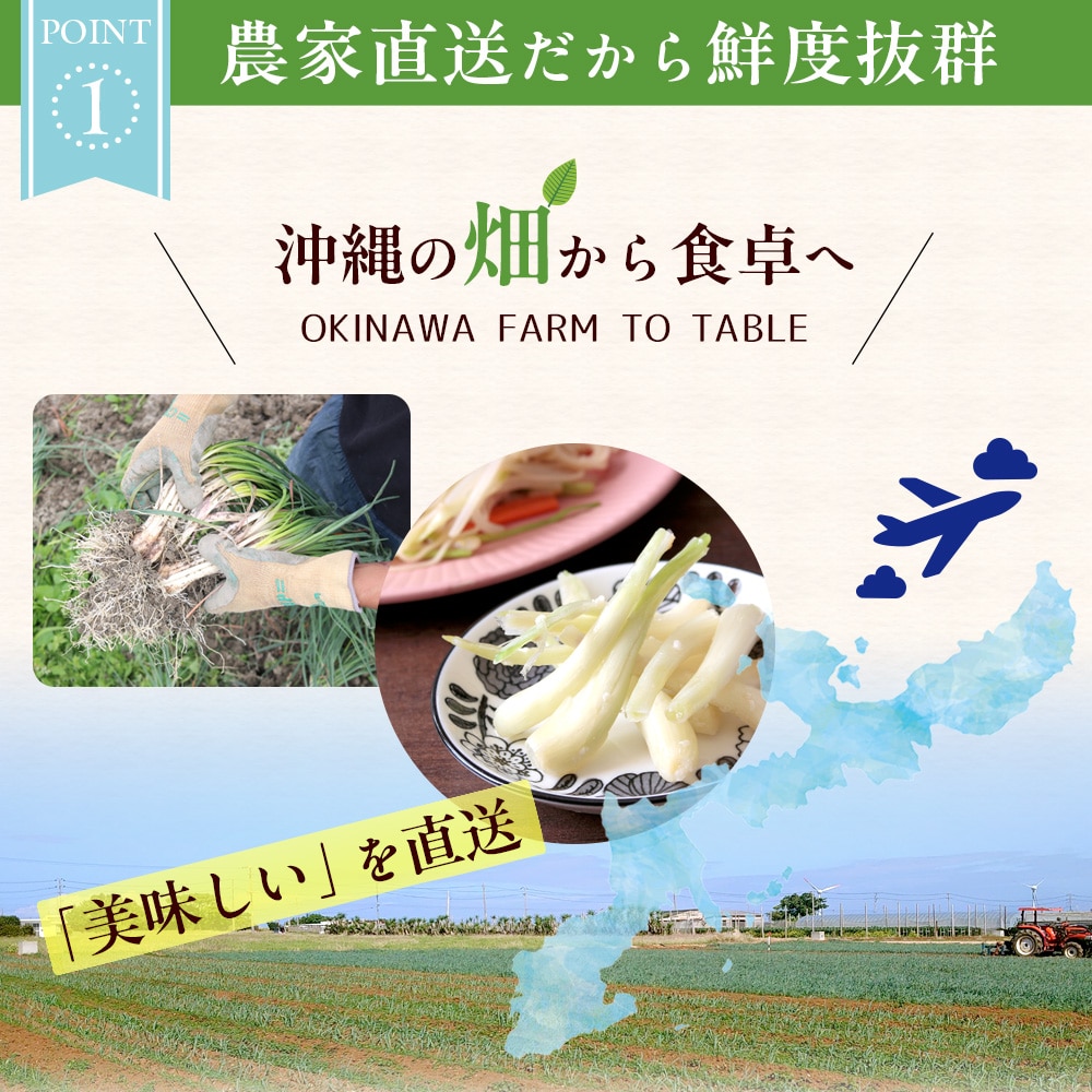 シャキッとした食感と、爽やかな辛みがたまらない「島らっきょう」。畑から収穫してすぐにお届けする農家直送の島らっきょうは、自然の恵みをそのままに、新鮮な味わいをお楽しみいただけます。沖縄の定番「塩漬け」「天ぷら」はもちろん、生のままで酢漬けにしても美味しい万能食材の島らっきょうを、たっぷりサイズでお届けします。