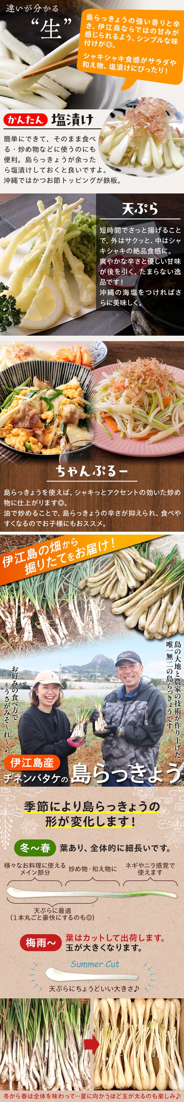 島らっきょうの本場・伊江島から掘りたてを直送。島尻マージと農家の技術が生んだ伊江島の島らっきょうは、ピリッとした辛さの中にほのかな甘みが広がる、格別な味わいです。定番の塩漬けや天ぷらはもちろん、生もおすすめ。他産地との違いをご自宅でご賞味ください。
