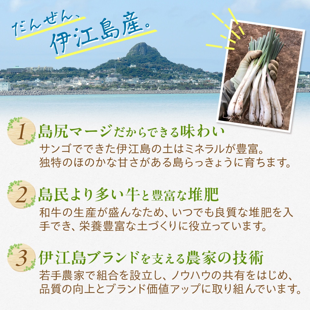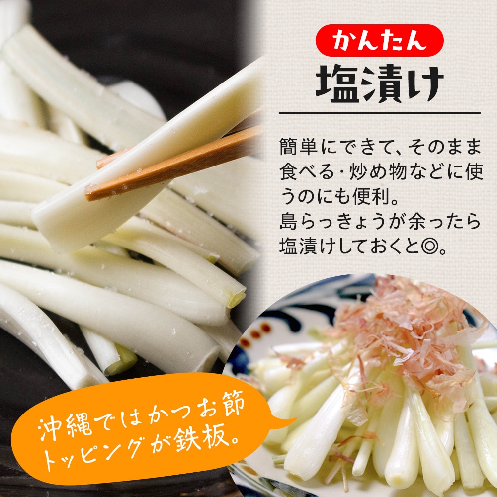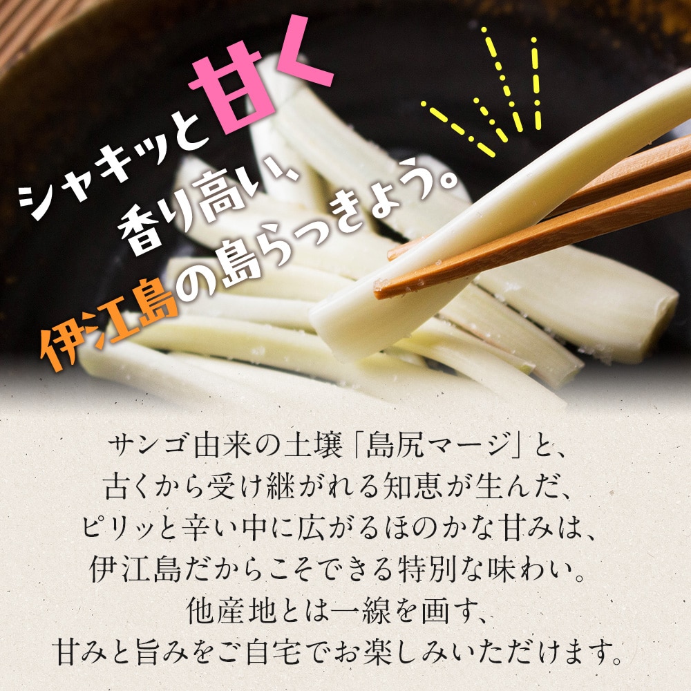 島らっきょうの本場・伊江島から掘りたてを直送。島尻マージと農家の技術が生んだ伊江島の島らっきょうは、ピリッとした辛さの中にほのかな甘みが広がる、格別な味わいです。定番の塩漬けや天ぷらはもちろん、生もおすすめ。他産地との違いをご自宅でご賞味ください。