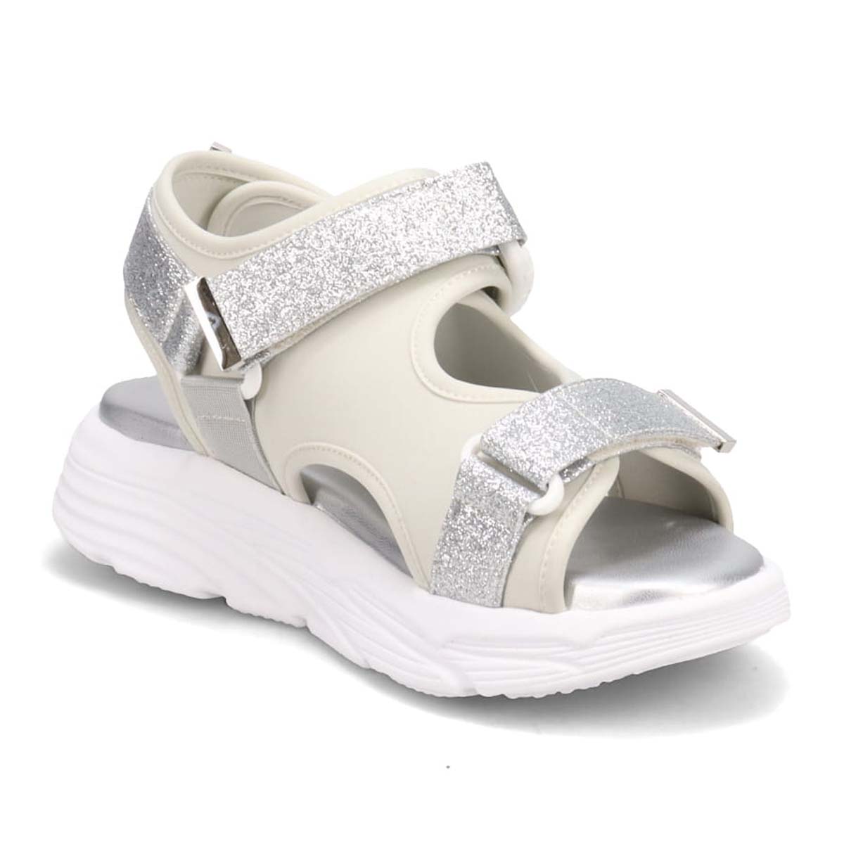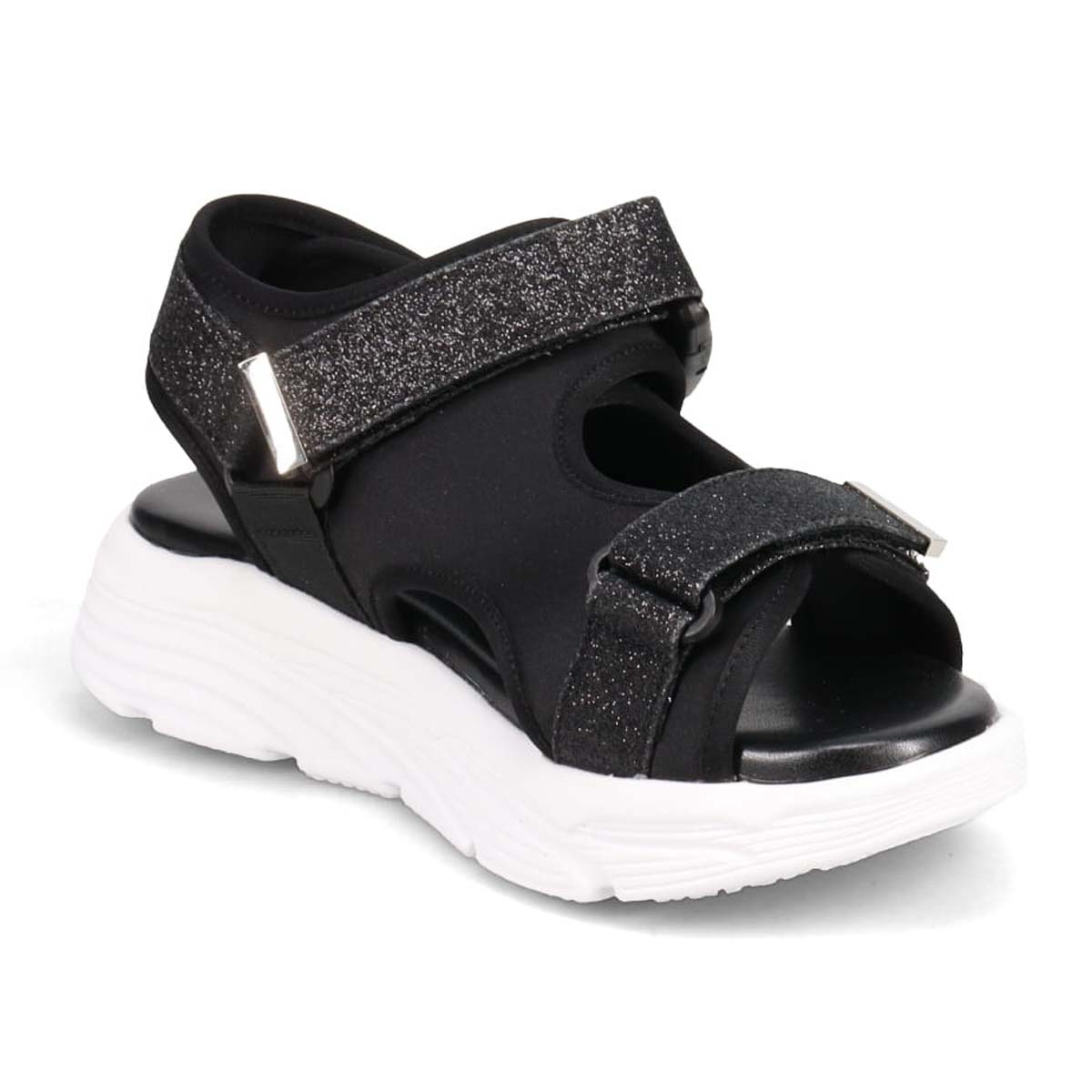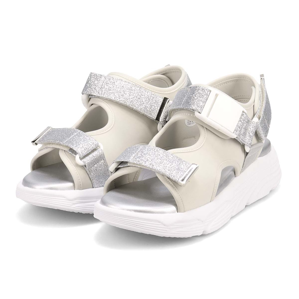 軽量で履き心地が抜群なグリッターベルテッドスポーツサンダルです。面ファスナーを使って甲や足首をしっかり調整でき、バックルで簡単に着脱できます。快適さと便利さを兼ね備えたデザインなので、日常使いにぴったりです。