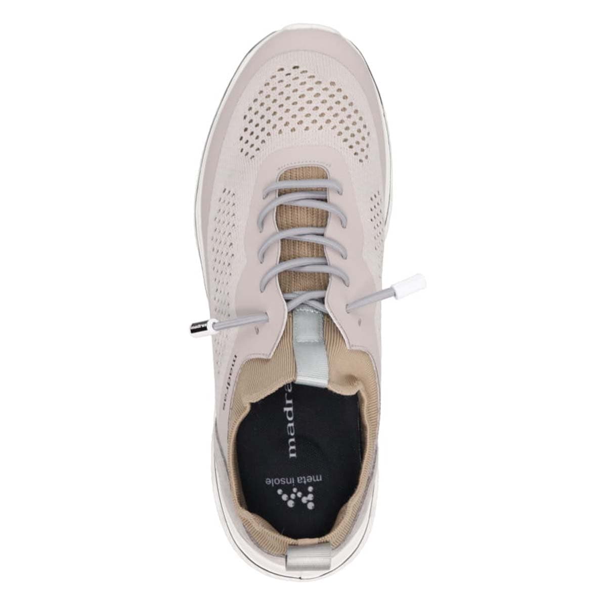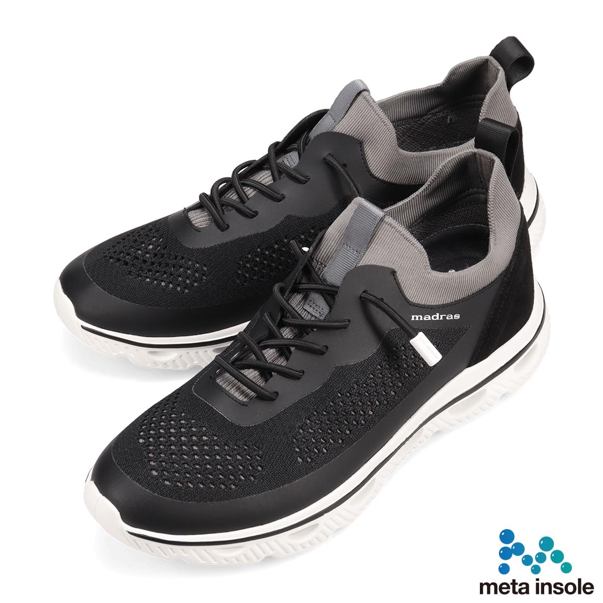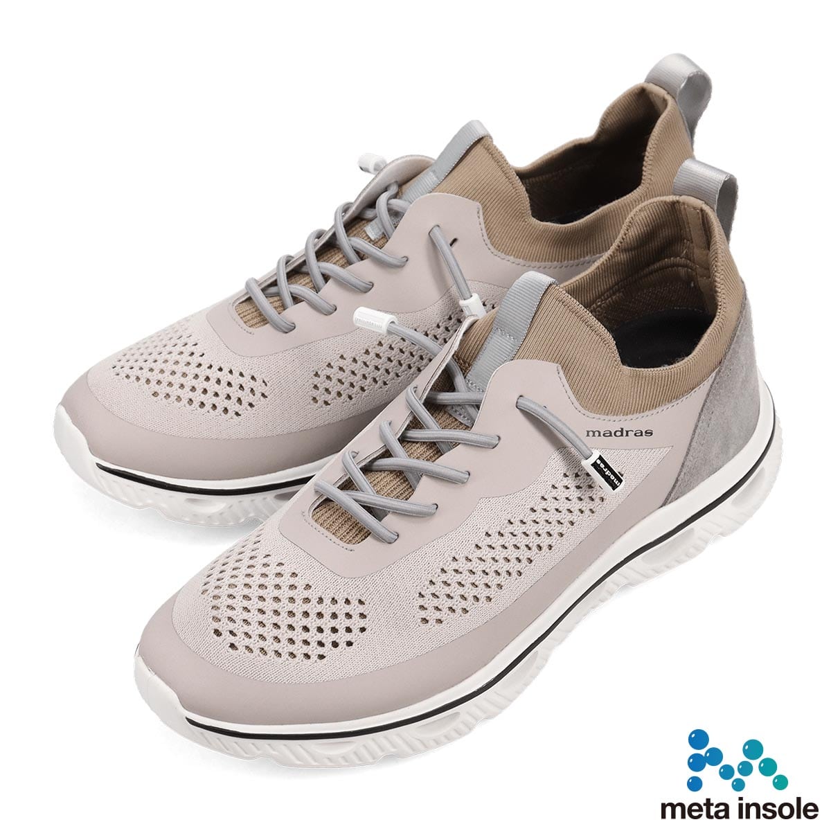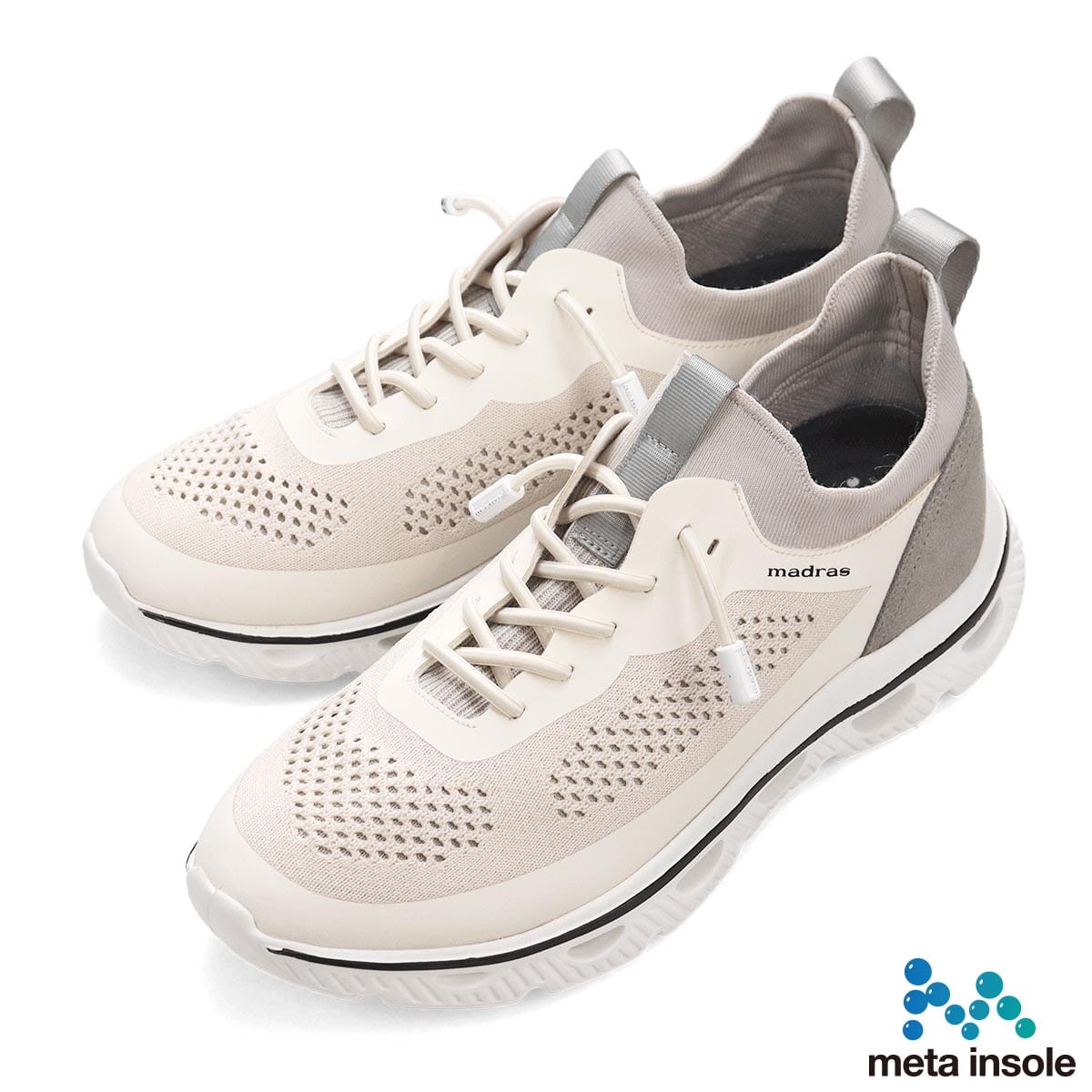 レイヤーデザインで軽さと透け感が表現されたニットスニーカー。履き口からつま先まで、立体成型で編み込みされたニットは、着用の際の圧迫感を軽減しストレスフリーな履き心地。ソールにあけられた横穴は靴内部の湿気を外部に逃がす通気口の役目と、衝撃を吸収するクッションの役割を果たします。高い衝撃吸収性と反発弾性に富み、医療分野でも活躍する超柔軟ゲル素材(クリスタルゲル®)を、マドラスのノウハウによってフットウェア向けに具現化したアクティブタイプの『metaインソール』を搭載。アクティブタイプの『metaインソール』は取り外しが可能なので、靴内部を快適に保ちます。【metaインソール】唯一無二の履き心地を実現したmetaインソールはマドラス株式会社独自の開発ノウハウと株式会社タナックの超柔軟ゲル素材「クリスタルゲル®」を用いて開発。足裏から姿勢を整え、快適な歩行をサポートするセラピースタイルインソールです。特徴①足裏3つのアーチを支え、正しい姿勢をサポート。②あらゆる足裏形状にもフィットする超柔軟ゲル素材「クリスタルゲル®」を採用。③「クリスタルゲル®」はその安全性から医療分野でも活用されています。④異なる硬度で配置し直接効果的にサポートします。⑤理想的な足圧分布で疲労軽減する効果があります。⑥高反発弾性により快適な歩行をサポートします。