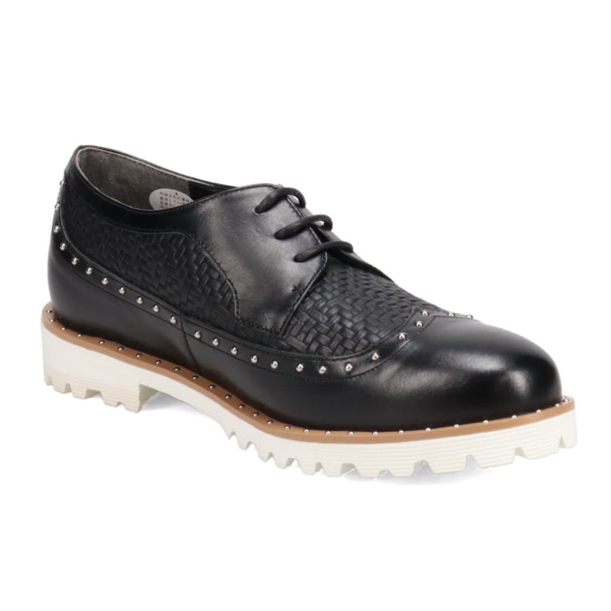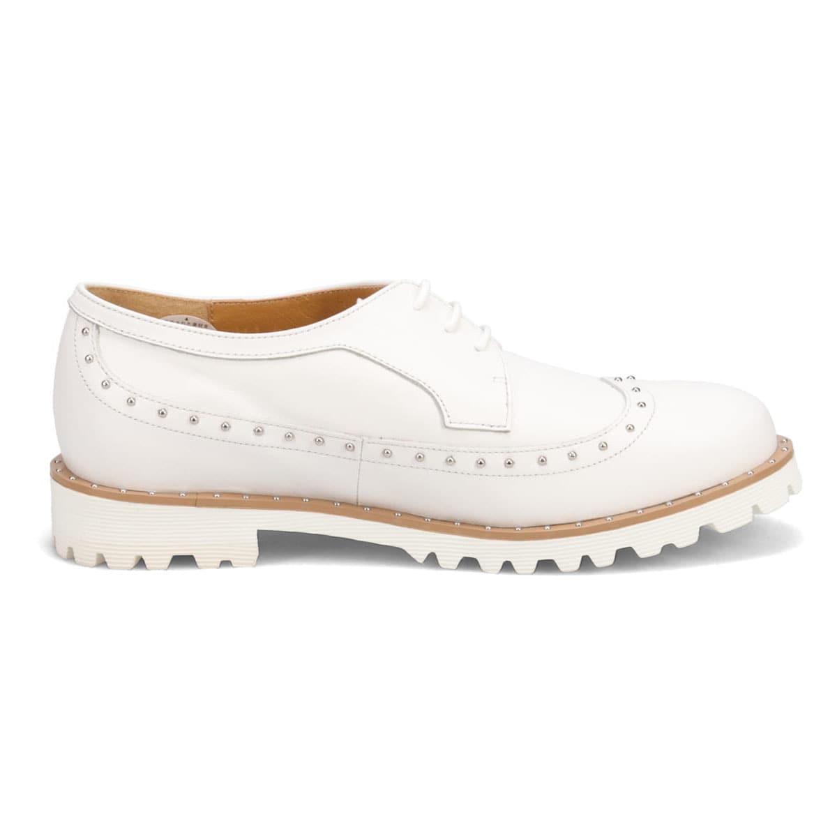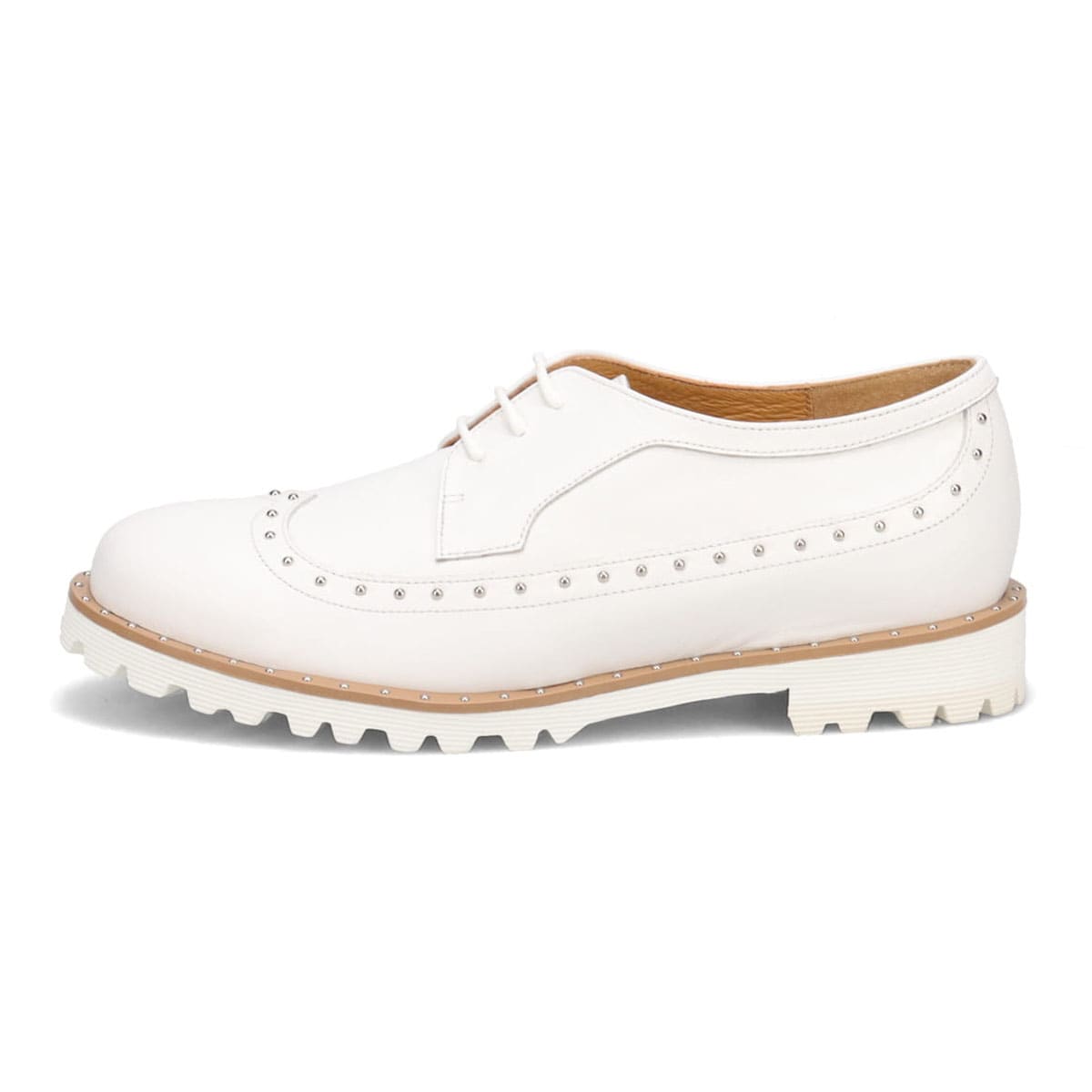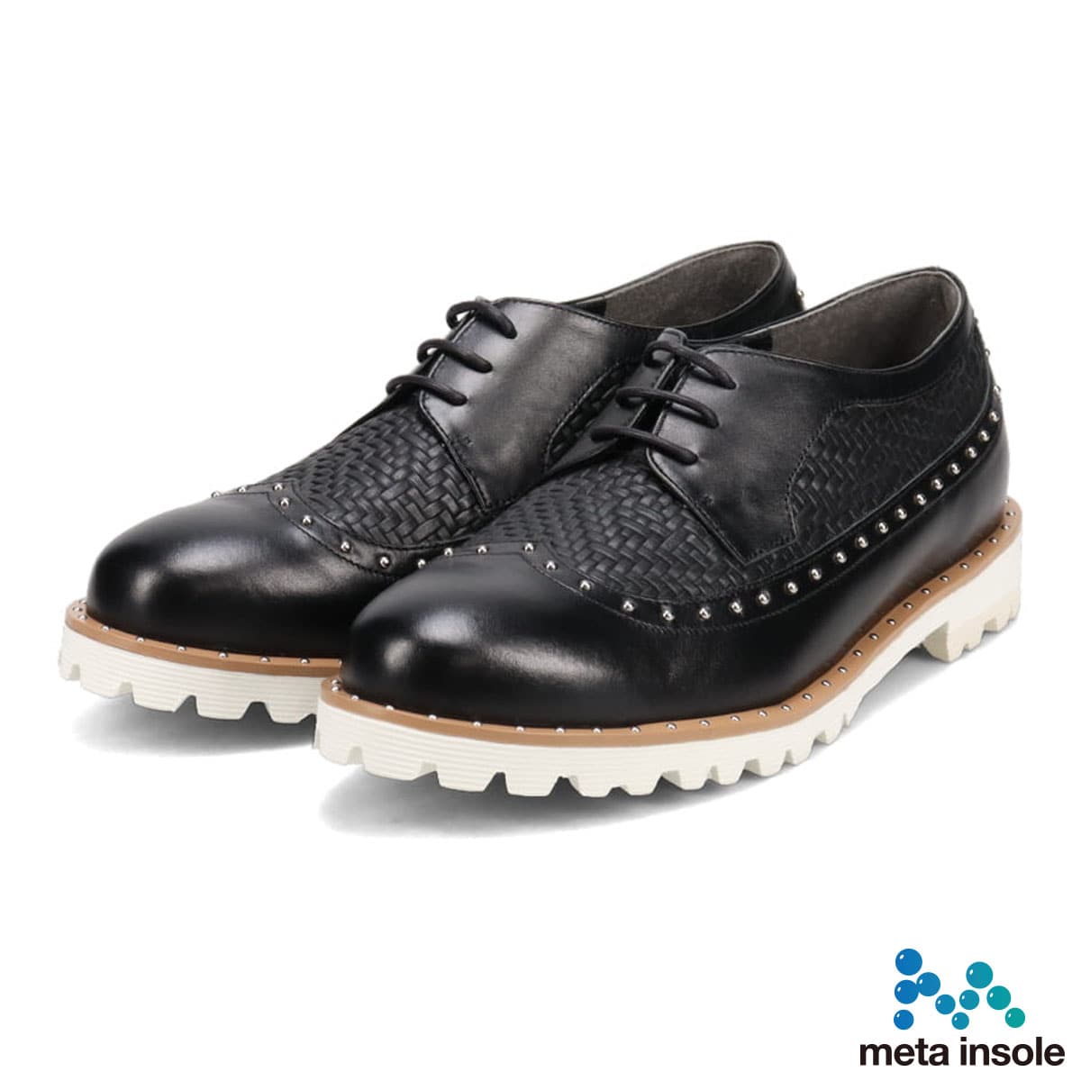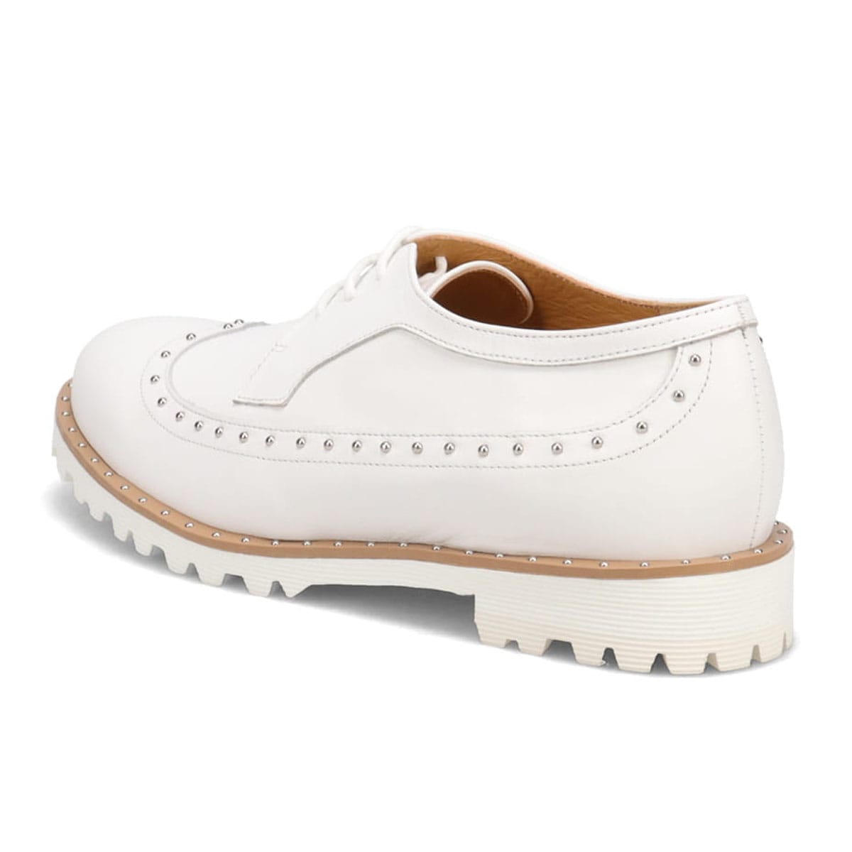 上質できちんと感のあるメタインソール搭載。スタッズデザインの厚底レースアップローファー。フロントからサイドに施したシルバースタッズのモードさが絶妙なバランスで洗練されたデザインに。ボリューミーなトラックソールでトレンドライクなフォルムに仕上がりました。ボリュームのあるソールでより足をすらりと見せてくれスタイルアップに。