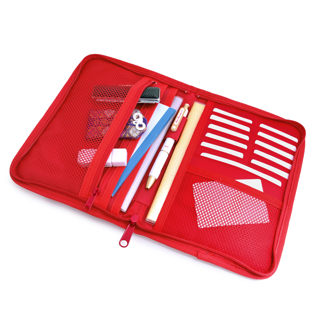 貴重品を収納できるファスナー付きポケットやカードポケット、ペンホルダー、中身が確認できるメッシュポケットなど小分けに便利なポケットが満載です。