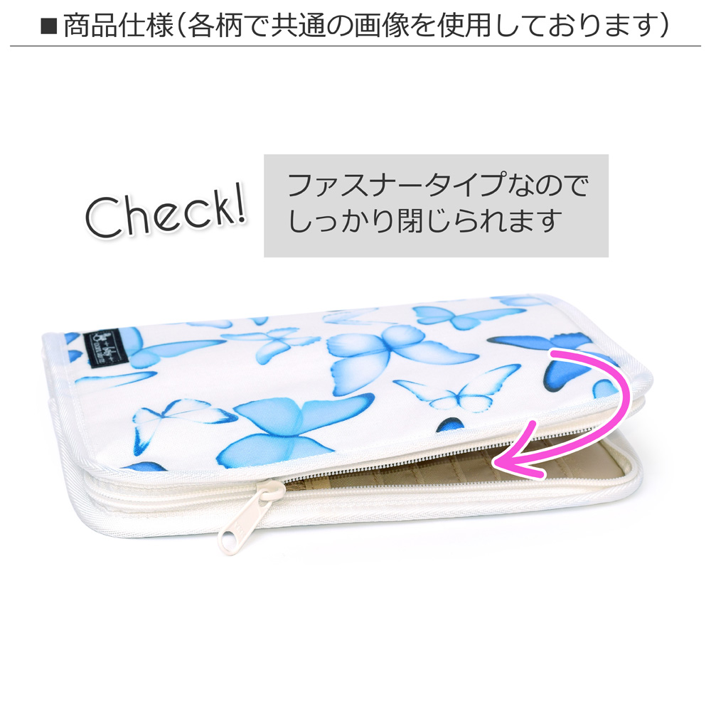ファスナーで周囲をしっかりと開閉できるタイプで、中身を落とす心配がありません。Mサイズの母子手帳(タテ約18.2cm×ヨコ約12.8cm)に対応しています。